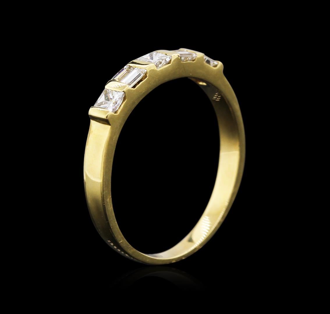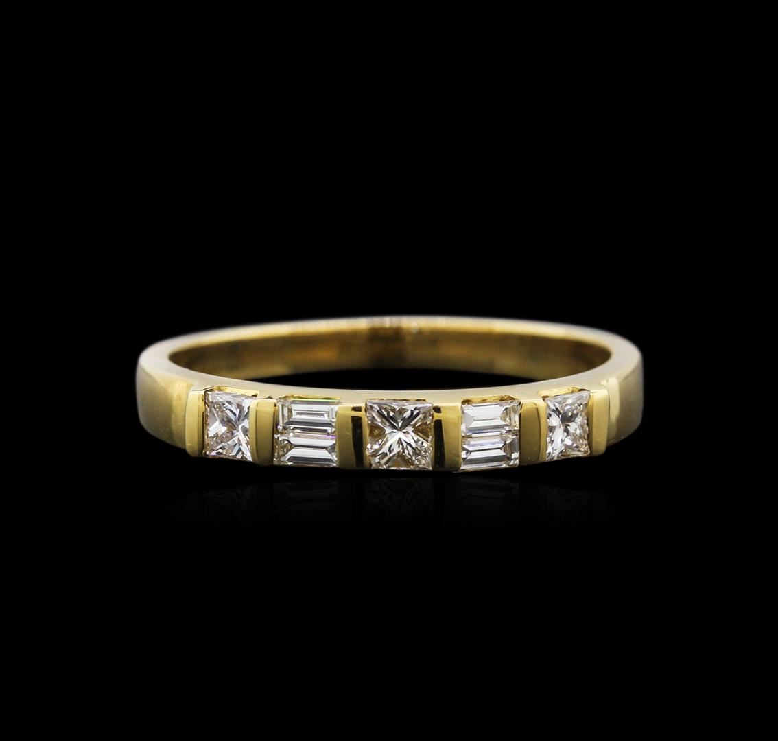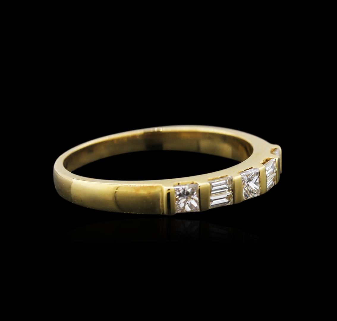 One electronically tested 18KT yellow gold ladies cast diamond ring with a flat shank with rounded edges with a bright polish finish. Identified with markings of "18K". Condition is new. Containing: Three channel set princess cut diamonds, measuring 2.50 x 2.50 x 1.88mm (depth est.) approximate total weight of 3 Stones = 0.29ct. Clarity: VS-2. Color: I - J, Cut is Good. Four baguette cut diamonds, measuring 2.00 x 1.30 x 1.11mm (depth est.) approximate total weight of 4 Stones = 0.11ct. Diamonds are graded in the mounting, unless otherwise stated. Total Weight of Diamonds 0.40ct. Total Weight of Ring 3.10 grams. GGL Appraised at $1,620.00.