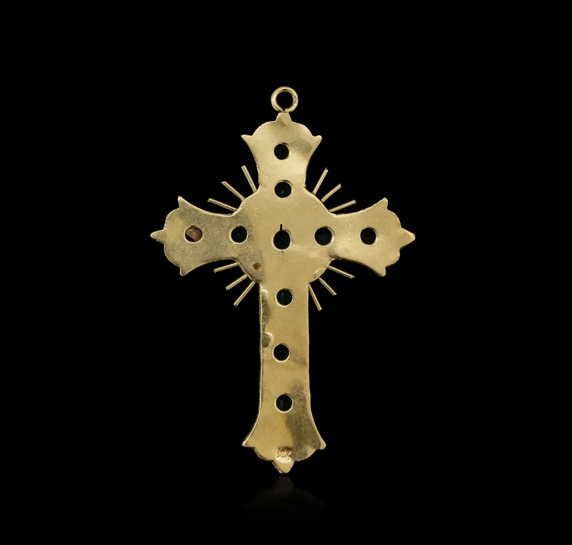 One cross pendant featuring: 18KT yellow gold weighing 2.80 grams containing emeralds with a total weight of 0.55ct.