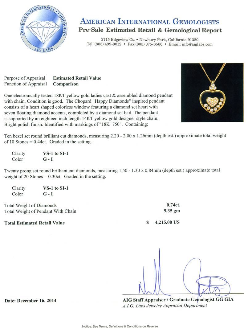 One electronically tested 18KT yellow gold ladies cast & assembled diamond pendant with chain. The Chopard "Happy Diamonds" inspired pendant consists of a heart shaped colorless window featuring a diamond set heart with seven floating diamond accents, completed by a diamond set bail. The pendant is supported by an eighteen inch length 14KT yellow gold designer style chain. Bright polish finish. Identified with markings of 18K 750. Condition is good. Containing: Ten bezel set round brilliant cut diamonds, measuring 2.20 - 2.00 x 1.26mm (depth est.) approximate total weight of 10 Stones = 0.44ct. Graded in the setting. Clarity: VS-1 to SI-1. Color: G - I. Twenty prong set round brilliant cut diamonds, measuring 1.50 - 1.30 x 0.84mm (depth est.) approximate total weight of 20 Stones = 0.30ct. Graded in the setting. Clarity: VS-1 to SI-1. Color: G - I. Total Weight of Diamonds 0.74ct. Total Weight of Pendant With Chain 9.35 grams. AIG Appraised at $4,215.00.