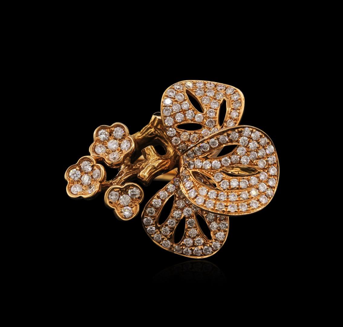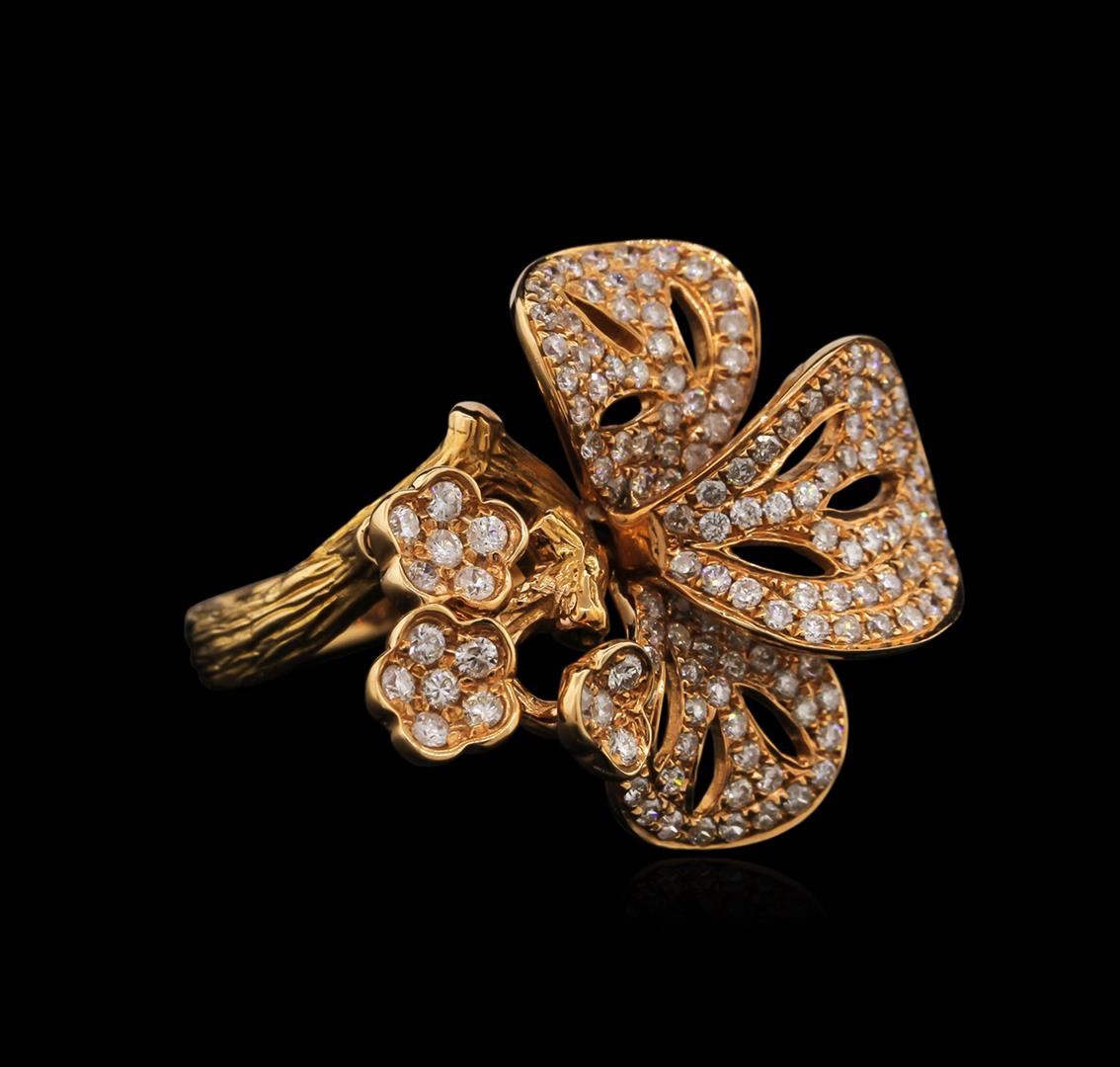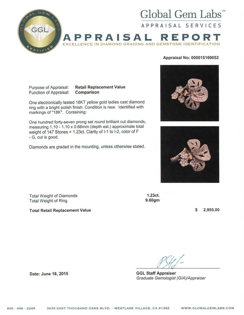 One electronically tested 18KT yellow gold ladies cast diamond ring with a bright polish finish. Identified with markings of "18K". Condition is new. Containing: One Hundred Forty-Seven prong set round brilliant cut diamonds, measuring 1.10 - 1.10 x 0.66mm (depth est.) approximate total weight of 147 Stones = 1.23ct. Clarity: I-1 to I-2. Color: F - G, Cut is Good. Diamonds are graded in the mounting, unless otherwise stated. Total Weight of Diamonds 1.23ct. Total Weight of Ring 9.60 grams. GGL Appraised at $2,955.00.