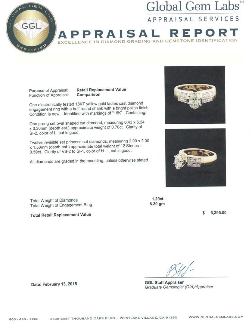 One electronically tested 18KT yellow gold ladies cast diamond engagement ring with a half round shank with a bright polish finish. Identified with markings of "18K". Condition is new. Containing: One prong set oval shaped cut diamond, measuring 6.43 x 5.24 x 3.30mm (depth est.) approximate weight of 0.70ct. Clarity: SI-2. Color: L, Cut is Good. Twelve invisible set princess cut diamonds, measuring 2.00 x 2.00 x 1.50mm (depth est.) approximate total weight of 12 Stones = 0.59ct. Clarity: VS-2 to SI-1. Color: H - I, Cut is Good. All diamonds are graded in the mounting, unless otherwise stated. Total Weight of Diamonds 1.29ct. Total Weight of Engagement Ring 8.30 grams. GGL Appraised at $6,395.00.