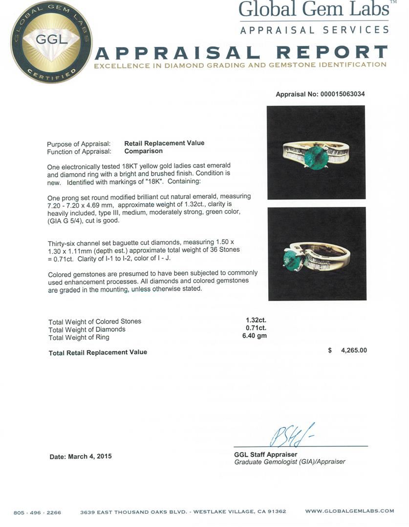 One electronically tested 18KT yellow gold ladies cast emerald and diamond ring with a bright and brushed finish. Identified with markings of "18K". Condition is new. Containing: One prong set round modified brilliant cut natural emerald, measuring 7.20 - 7.20 x 4.69 mm, approximate weight of 1.32ct., clarity is heavily included, type III, medium, moderately strong, green color, (GIA G 5/4), cut is good. Thirty-Six channel set baguette cut diamonds, measuring 1.50 x 1.30 x 1.11mm (depth est.) approximate total weight of 36 Stones = 0.71ct. Clarity: I-1 to I-2. Color: I - J. Colored gemstones are presumed to have been subjected to commonly used enhancement processes. All diamonds and colored gemstones are graded in the mounting, unless otherwise stated. Total Weight of Colored Stones 1.32ct. Total Weight of Diamonds 0.71ct. Total Weight of Ring 6.40 grams. GGL Appraised at $4,265.00.