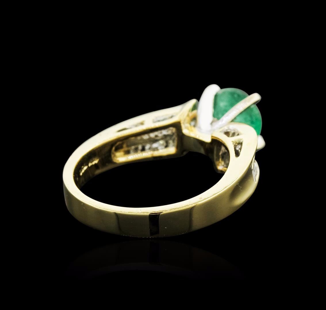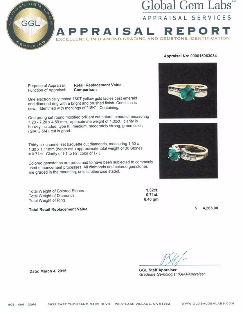 One electronically tested 18KT yellow gold ladies cast emerald and diamond ring with a bright and brushed finish. Identified with markings of "18K". Condition is new. Containing: One prong set round modified brilliant cut natural emerald, measuring 7.20 - 7.20 x 4.69 mm, approximate weight of 1.32ct., clarity is heavily included, type III, medium, moderately strong, green color, (GIA G 5/4), cut is good. Thirty-Six channel set baguette cut diamonds, measuring 1.50 x 1.30 x 1.11mm (depth est.) approximate total weight of 36 Stones = 0.71ct. Clarity: I-1 to I-2. Color: I - J. Colored gemstones are presumed to have been subjected to commonly used enhancement processes. All diamonds and colored gemstones are graded in the mounting, unless otherwise stated. Total Weight of Colored Stones 1.32ct. Total Weight of Diamonds 0.71ct. Total Weight of Ring 6.40 grams. GGL Appraised at $4,265.00.