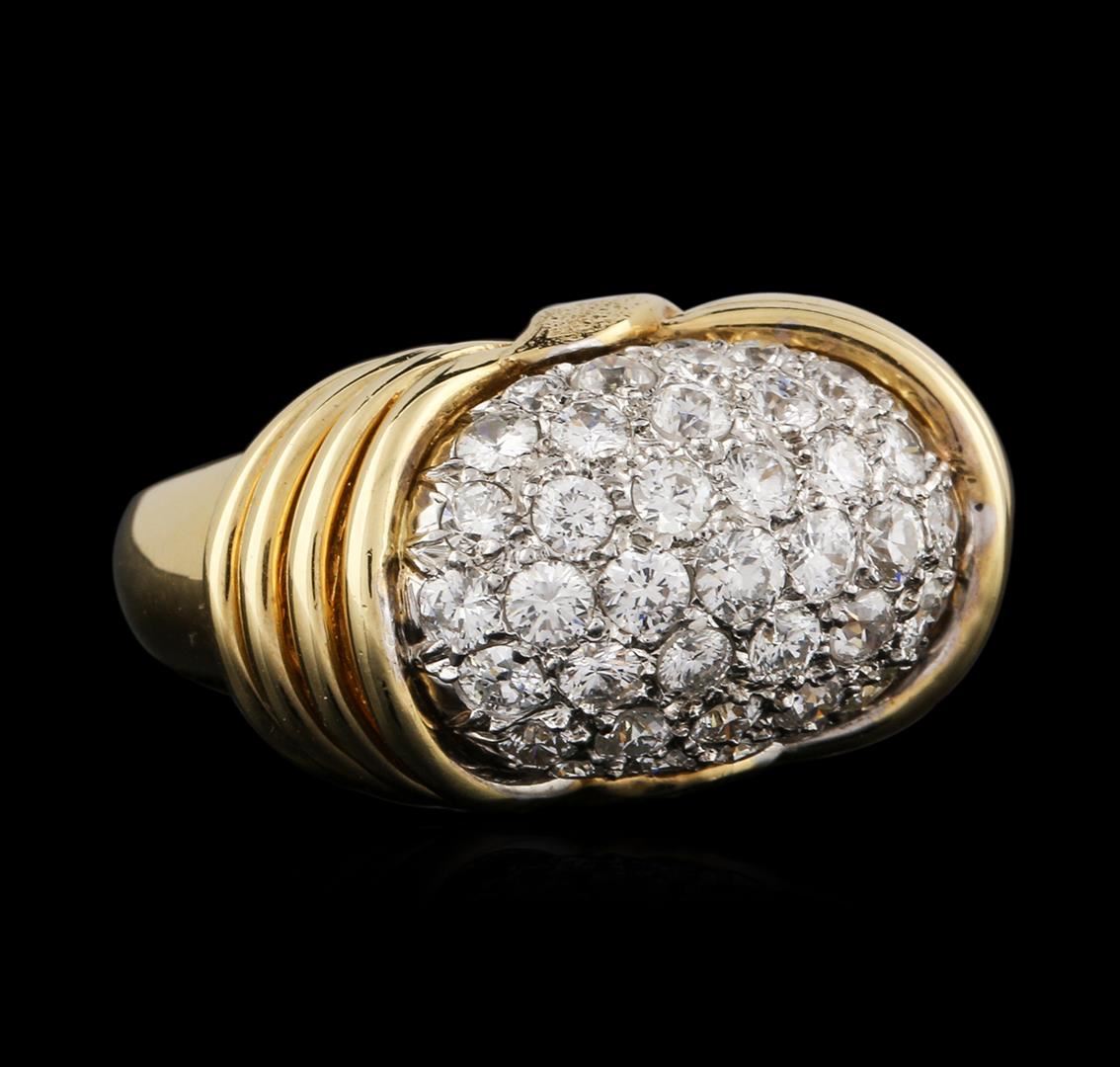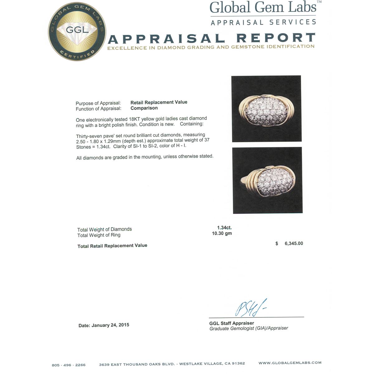 One electronically tested 18KT yellow gold ladies cast diamond ring with a bright polish finish. Condition is new. Containing: Thirty-Seven pave' set round brilliant cut diamonds, measuring 2.50 - 1.80 x 1.29mm (depth est.) approximate total weight of 37 Stones = 1.34ct. Clarity: SI-1 to SI-2. Color: H - I. All diamonds are graded in the mounting, unless otherwise stated. Total Weight of Diamonds 1.34ct. Total Weight of Ring 10.30 grams. GGL Appraised at $6,345.00.
