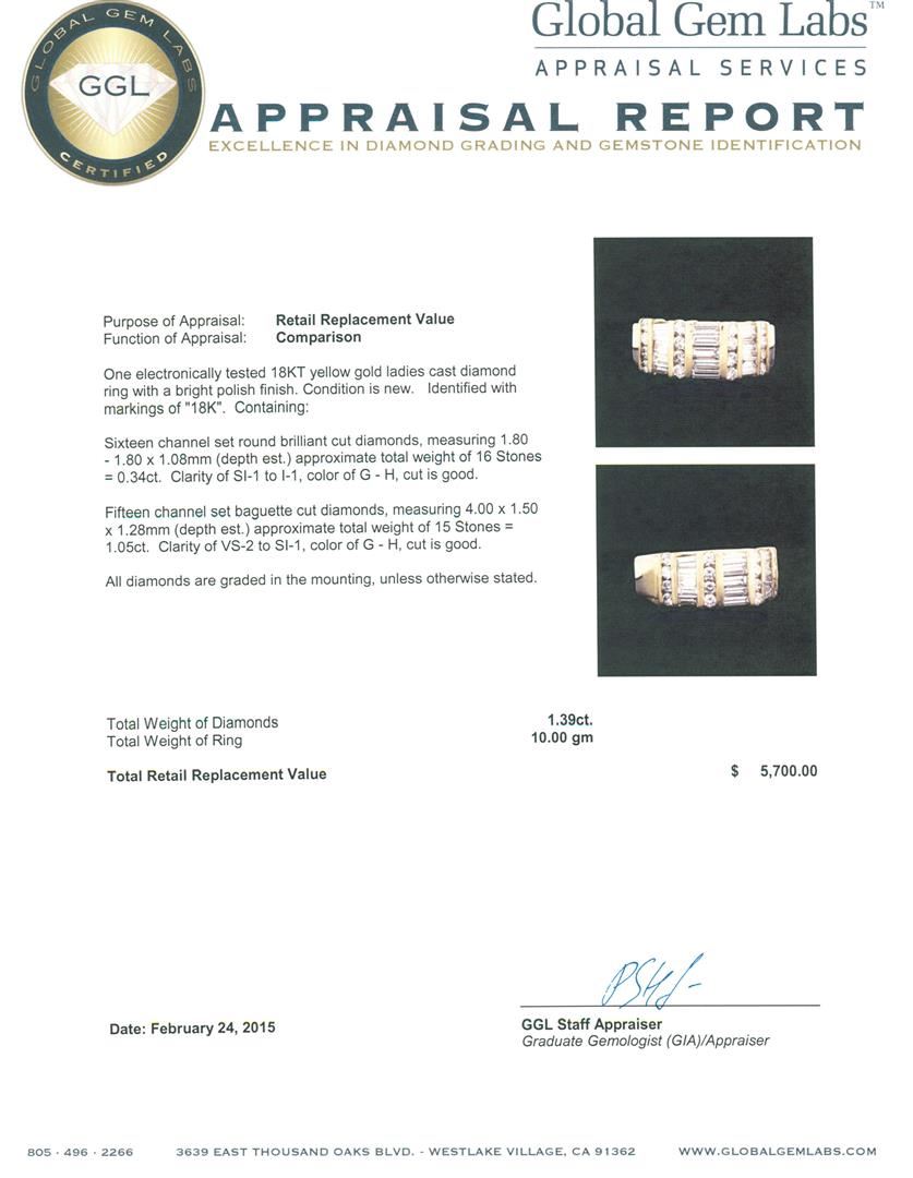 One electronically tested 18KT yellow gold ladies cast diamond ring with a bright polish finish. Identified with markings of "18K". Condition is new. Containing: Sixteen channel set round brilliant cut diamonds, measuring 1.80 - 1.80 x 1.08mm (depth est.) approximate total weight of 16 Stones = 0.34ct. Clarity: SI-1 to I-1. Color: G - H, Cut is Good. Fifteen channel set baguette cut diamonds, measuring 4.00 x 1.50 x 1.28mm (depth est.) approximate total weight of 15 Stones = 1.05ct. Clarity: VS-2 to SI-1. Color: G - H, Cut is Good. All diamonds are graded in the mounting, unless otherwise stated. Total Weight of Diamonds 1.39ct. Total Weight of Ring 10.00 grams. GGL Appraised at $5,700.00.