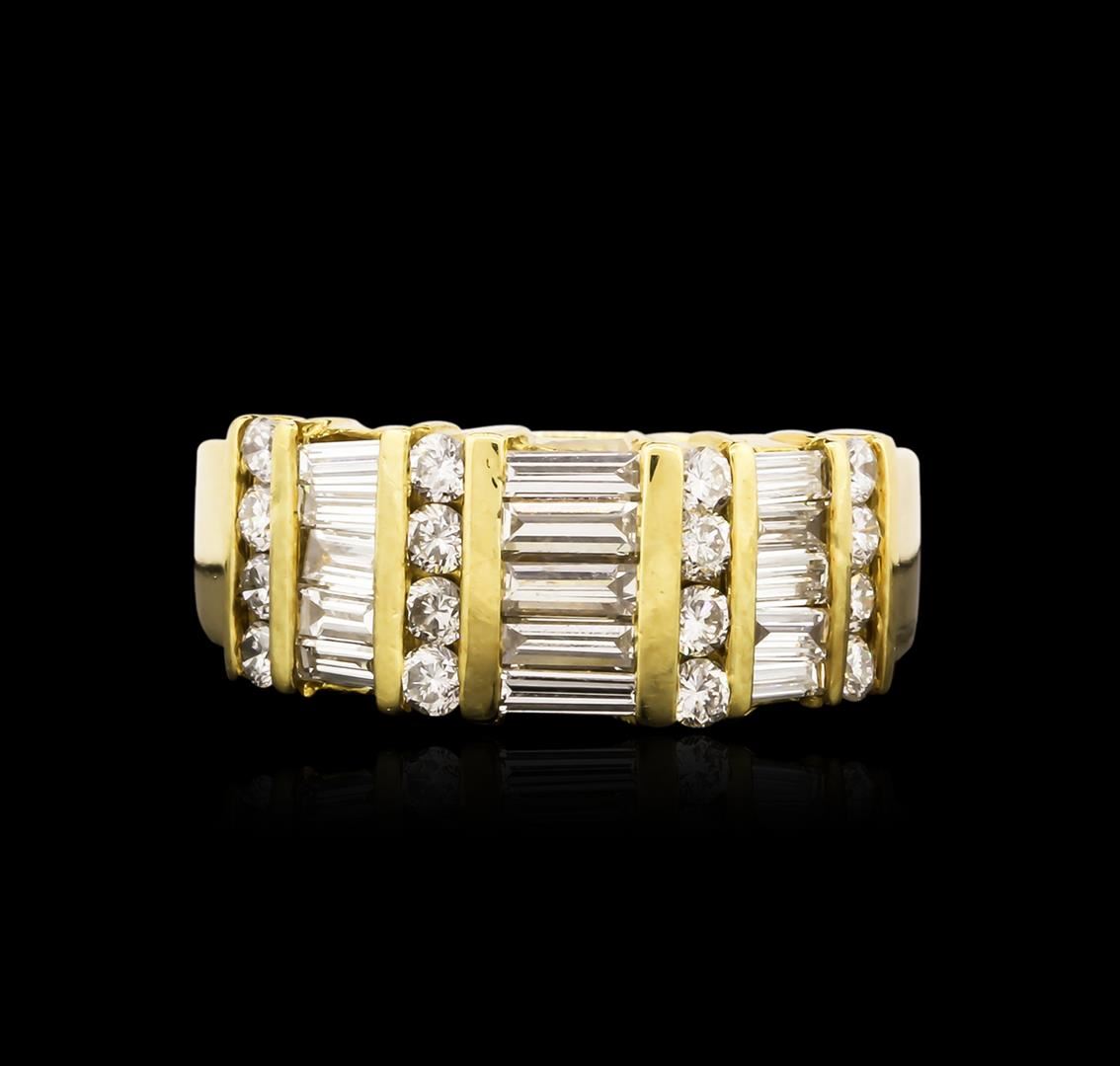 One electronically tested 18KT yellow gold ladies cast diamond ring with a bright polish finish. Identified with markings of "18K". Condition is new. Containing: Sixteen channel set round brilliant cut diamonds, measuring 1.80 - 1.80 x 1.08mm (depth est.) approximate total weight of 16 Stones = 0.34ct. Clarity: SI-1 to I-1. Color: G - H, Cut is Good. Fifteen channel set baguette cut diamonds, measuring 4.00 x 1.50 x 1.28mm (depth est.) approximate total weight of 15 Stones = 1.05ct. Clarity: VS-2 to SI-1. Color: G - H, Cut is Good. All diamonds are graded in the mounting, unless otherwise stated. Total Weight of Diamonds 1.39ct. Total Weight of Ring 10.00 grams. GGL Appraised.