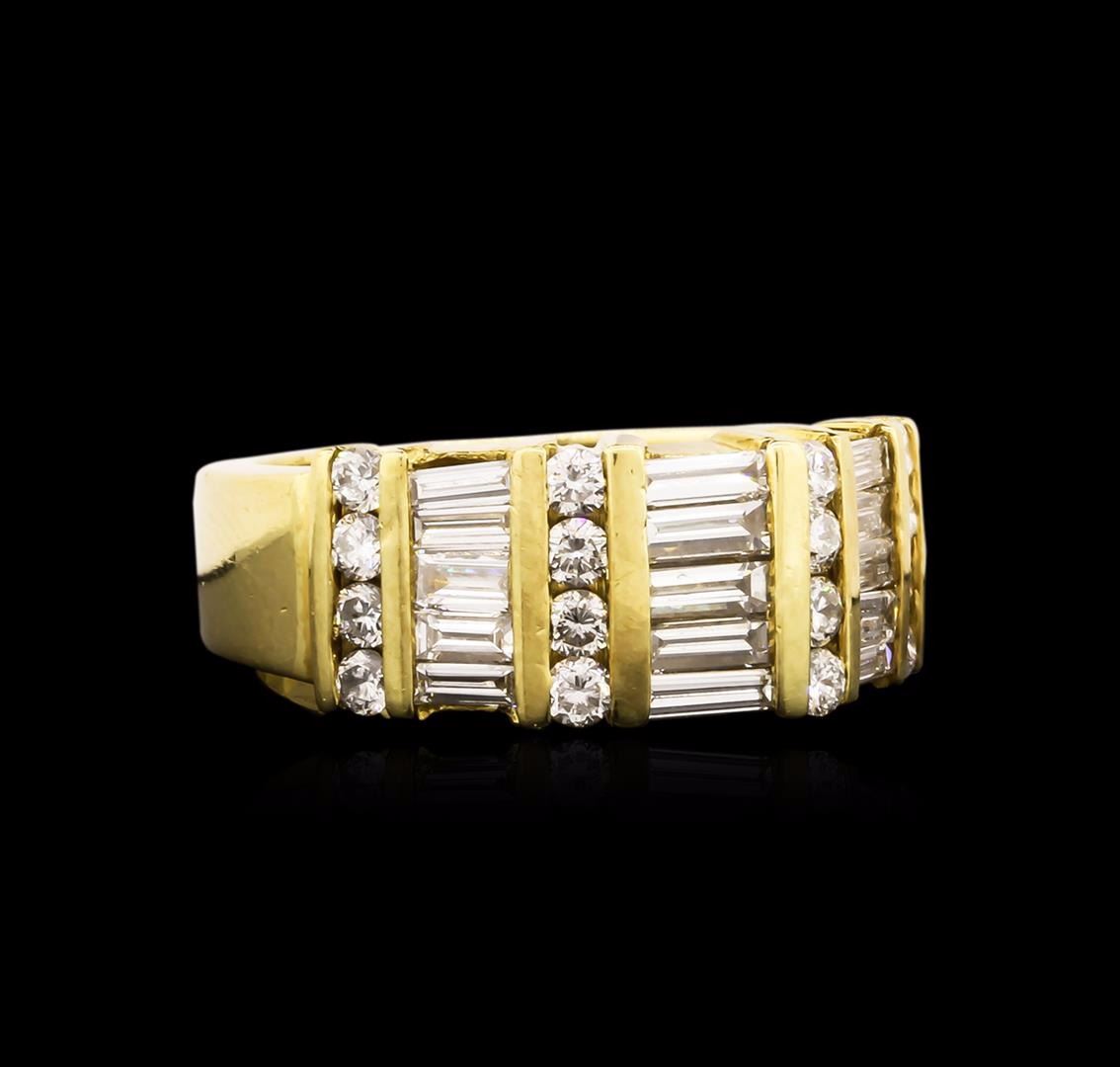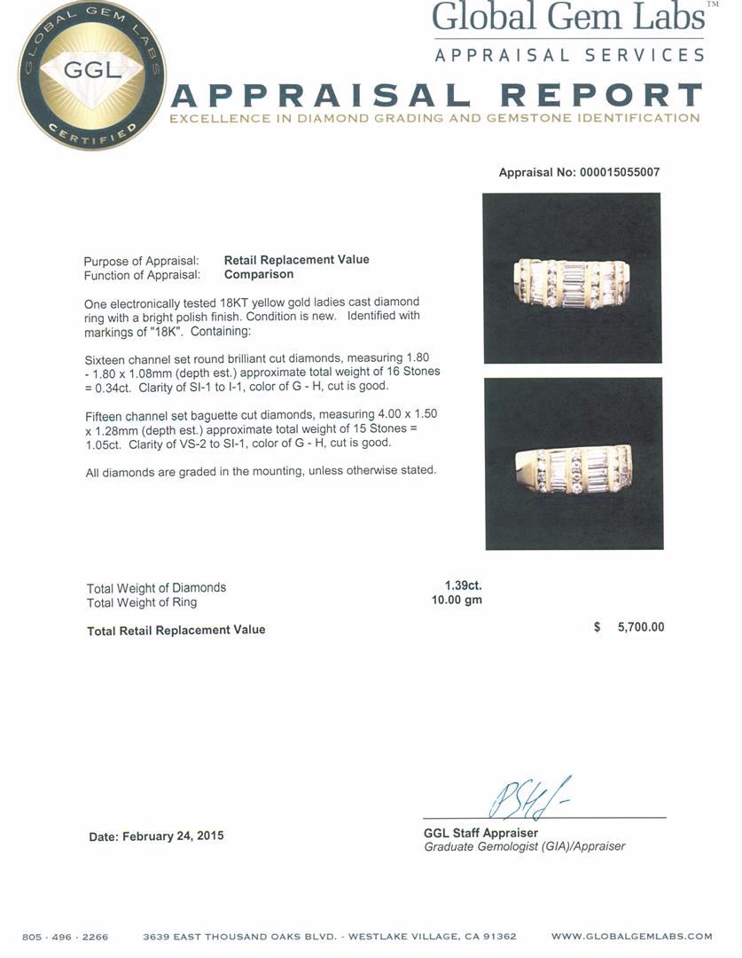 One electronically tested 18KT yellow gold ladies cast diamond ring with a bright polish finish. Identified with markings of "18K". Condition is new. Containing: Sixteen channel set round brilliant cut diamonds, measuring 1.80 - 1.80 x 1.08mm (depth est.) approximate total weight of 16 Stones = 0.34ct. Clarity: SI-1 to I-1. Color: G - H, Cut is Good. Fifteen channel set baguette cut diamonds, measuring 4.00 x 1.50 x 1.28mm (depth est.) approximate total weight of 15 Stones = 1.05ct. Clarity: VS-2 to SI-1. Color: G - H, Cut is Good. All diamonds are graded in the mounting, unless otherwise stated. Total Weight of Diamonds 1.39ct. Total Weight of Ring 10.00 grams. GGL Appraised at $5,700.00.