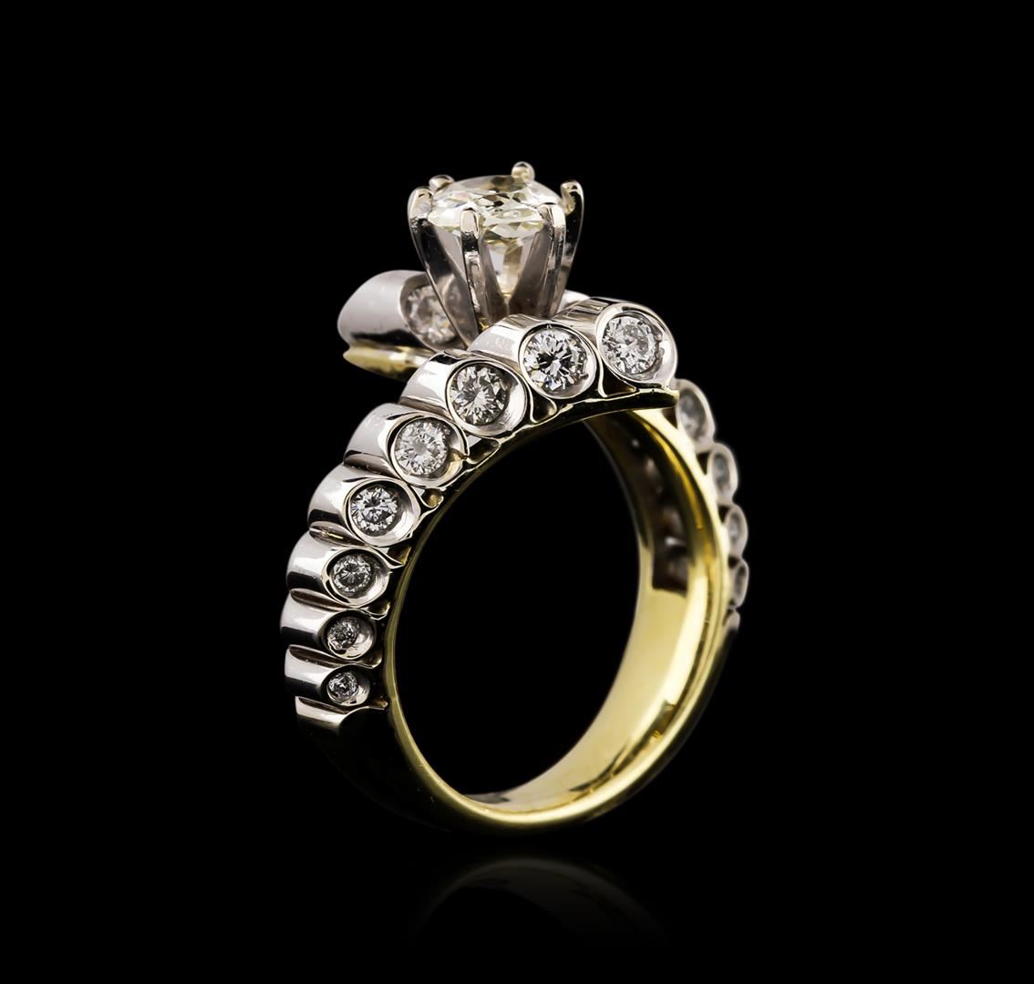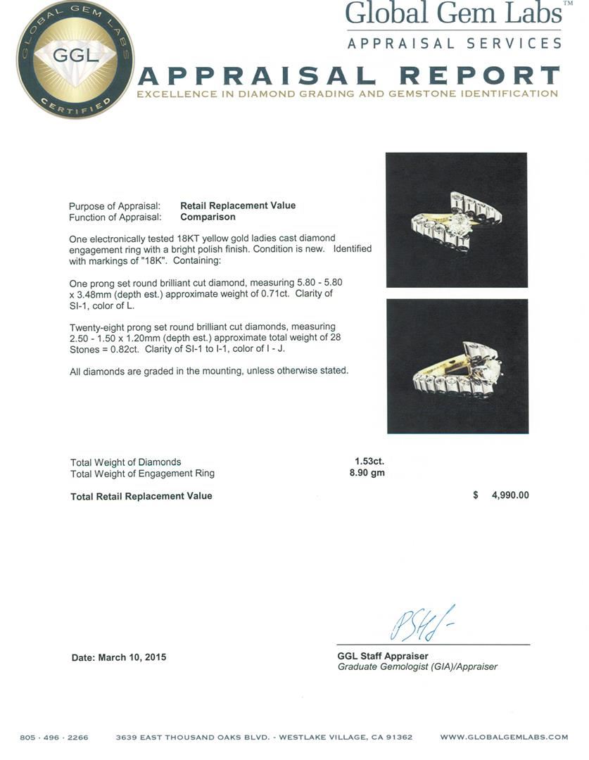 One electronically tested 18KT yellow gold ladies cast diamond engagement ring with a bright polish finish. Identified with markings of "18K". Condition is new. Containing: One prong set round brilliant cut diamond, measuring 5.80 - 5.80 x 3.48mm (depth est.) approximate weight of 0.71ct. Clarity: SI-1. Color: L. Twenty-Eight prong set round brilliant cut diamonds, measuring 2.50 - 1.50 x 1.20mm (depth est.) approximate total weight of 28 Stones = 0.82ct. Clarity: SI-1 to I-1. Color: I - J. All diamonds are graded in the mounting, unless otherwise stated. Total Weight of Diamonds 1.53ct. Total Weight of Engagement Ring 8.90 grams. GGL Appraised at $4,990.00.