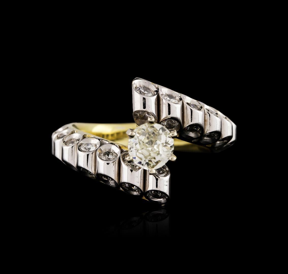 One electronically tested 18KT yellow gold ladies cast diamond engagement ring with a bright polish finish. Identified with markings of "18K". Condition is new. Containing: One prong set round brilliant cut diamond, measuring 5.80 - 5.80 x 3.48mm (depth est.) approximate weight of 0.71ct. Clarity: SI-1. Color: L. Twenty-Eight prong set round brilliant cut diamonds, measuring 2.50 - 1.50 x 1.20mm (depth est.) approximate total weight of 28 Stones = 0.82ct. Clarity: SI-1 to I-1. Color: I - J. All diamonds are graded in the mounting, unless otherwise stated. Total Weight of Diamonds 1.53ct. Total Weight of Engagement Ring 8.90 grams. GGL Appraised.