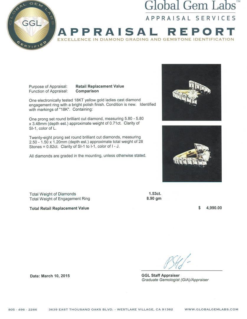 One electronically tested 18KT yellow gold ladies cast diamond engagement ring with a bright polish finish. Identified with markings of "18K". Condition is new. Containing: One prong set round brilliant cut diamond, measuring 5.80 - 5.80 x 3.48mm (depth est.) approximate weight of 0.71ct. Clarity: SI-1. Color: L. Twenty-Eight prong set round brilliant cut diamonds, measuring 2.50 - 1.50 x 1.20mm (depth est.) approximate total weight of 28 Stones = 0.82ct. Clarity: SI-1 to I-1. Color: I - J. All diamonds are graded in the mounting, unless otherwise stated. Total Weight of Diamonds 1.53ct. Total Weight of Engagement Ring 8.90 grams. GGL Appraised.