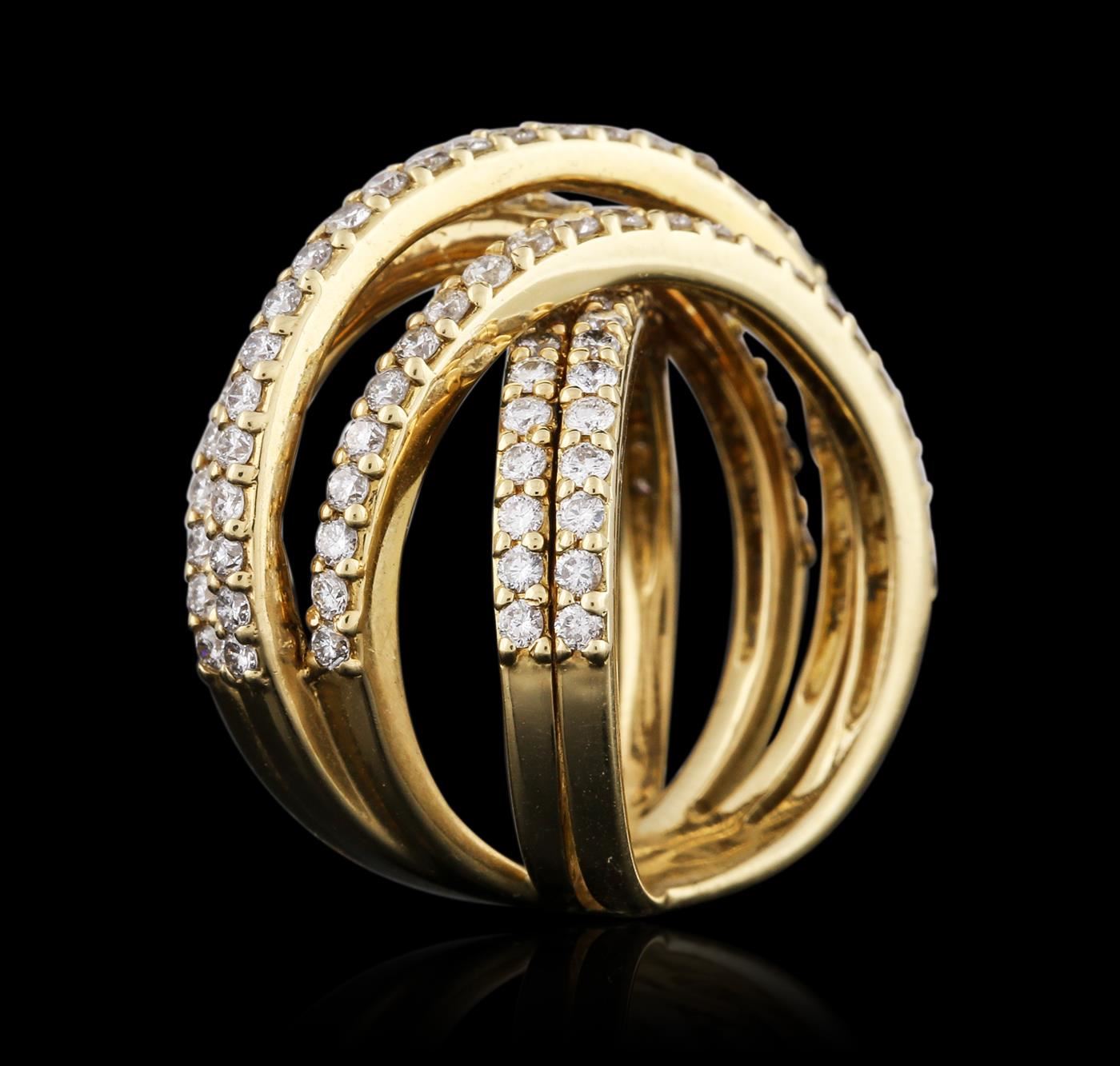 One electronically tested 18KT yellow gold ladies cast diamond ring with a bright polish finish. Trademark is Sonia B. Identified with markings of "18K". Condition is new. Containing: One Hundred Nine prong set round brilliant cut diamonds, measuring 1.60 - 1.60 x 0.96mm (depth est.) approximate total weight of 109 Stones = 1.62ct. Clarity: SI-1 to SI-2. Color: H - I, Cut is Good. All diamonds are graded in the mounting, unless otherwise stated. Total Weight of Diamonds 1.62ct. Total Weight of Ring 14.00. grams. GGL Appraised at $5,765.00.