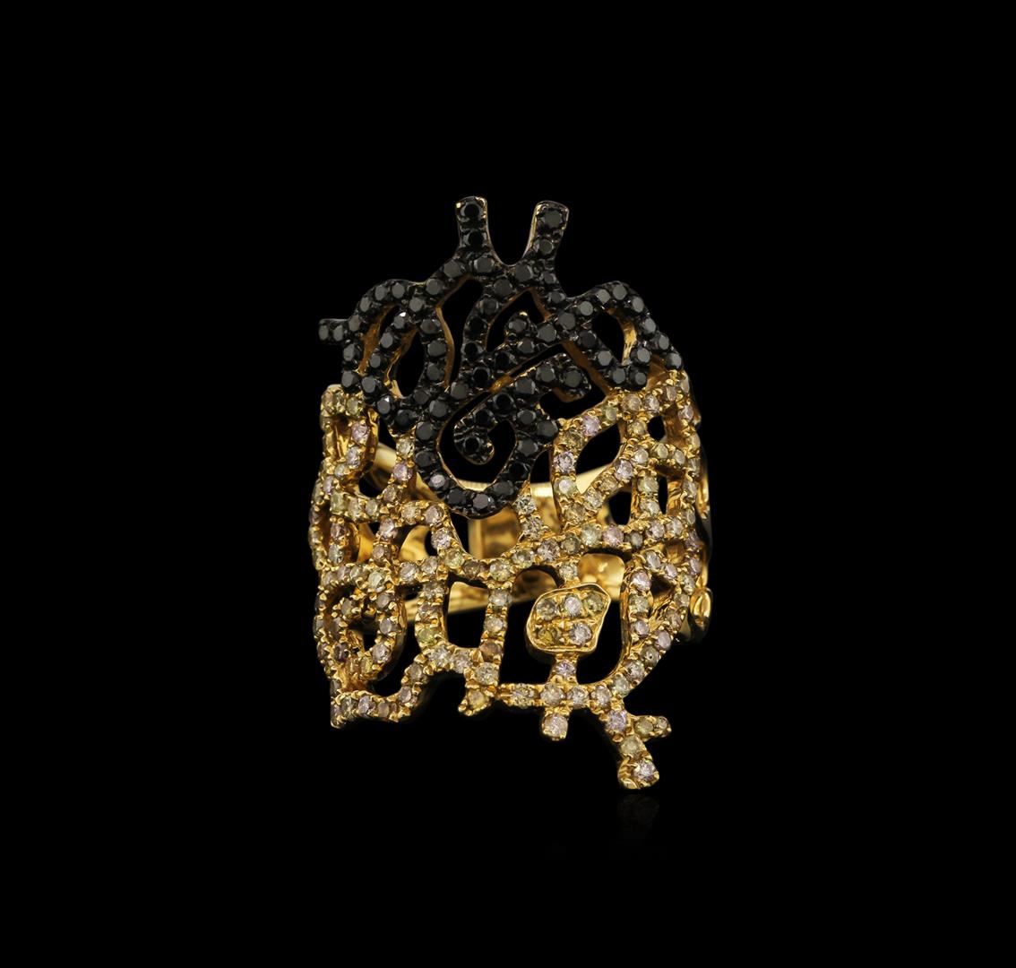 One electronically tested 18KT yellow gold ladies cast diamond ring with a bright polish finish. Identified with markings of "18K". Condition is new. Containing: Sixty-Nine prong set round brilliant cut diamonds, measuring 1.10 - 1.10 x 0.66mm (depth est.) approximate total weight of 69 Stones = 0.59ct. Cut is Good. One Hundred Thirty-One prong set round brilliant cut diamonds, measuring 1.10 - 1.10 x 0.66mm (depth est.) approximate total weight of 131 Stones = 1.04ct. Clarity: SI-1 to I-1, Cut is Good. Diamonds are graded in the mounting, unless otherwise stated. Total Weight of Diamonds 1.63ct. Total Weight of Ring 11.00 grams. GGL Appraised at $5,875.00.