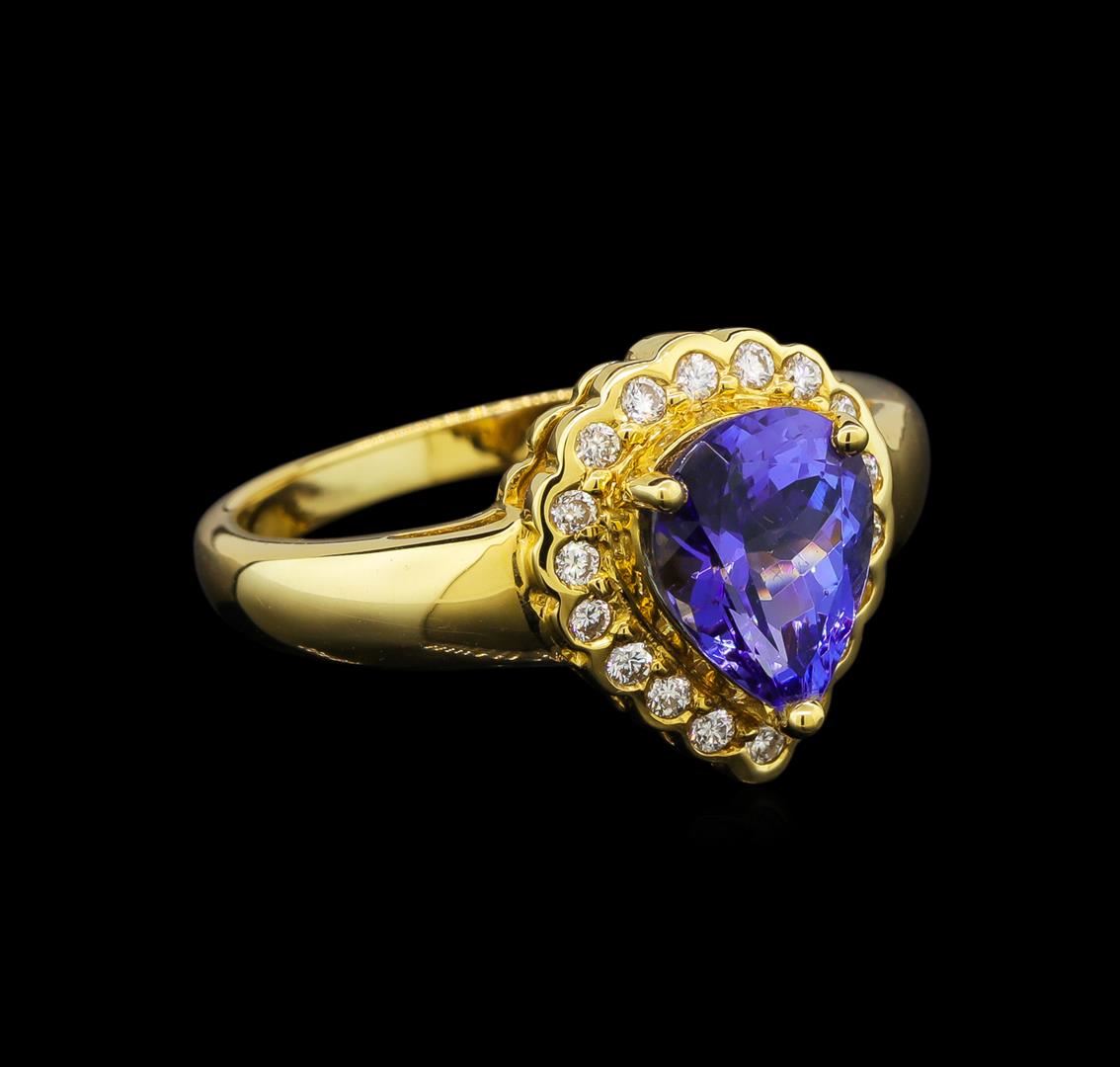 One electronically tested 18KT yellow gold ladies cast tanzanite and diamond ring with a bright polish finish. Identified with markings of "18K". Condition is new. Containing: One prong set pear modified brilliant cut natural tanzanite, measuring 8.70 x 6.70 x 4.36mm, approximate weight of 1.70ct., clarity is eye clean, type I, medium light, very slightly grayish, bluish violet color, (GIA bV 4/3), cut is good. Eighteen prong set round brilliant cut diamonds, measuring 1.20 - 1.20 x 0.72mm (depth est.) approximate total weight of 18 Stones = 0.11ct. Clarity: SI-2 to I-1. Color: I - J. Colored gemstones are presumed to have been subjected to commonly used enhancement processes. All diamonds and colored gemstones are graded in the mounting, unless otherwise stated. Total Weight of Colored Stones 1.70ct. Total Weight of Diamonds 0.11ct. Total Weight of Ring 4.60 grams. GGL Appraised at $2,065.00.