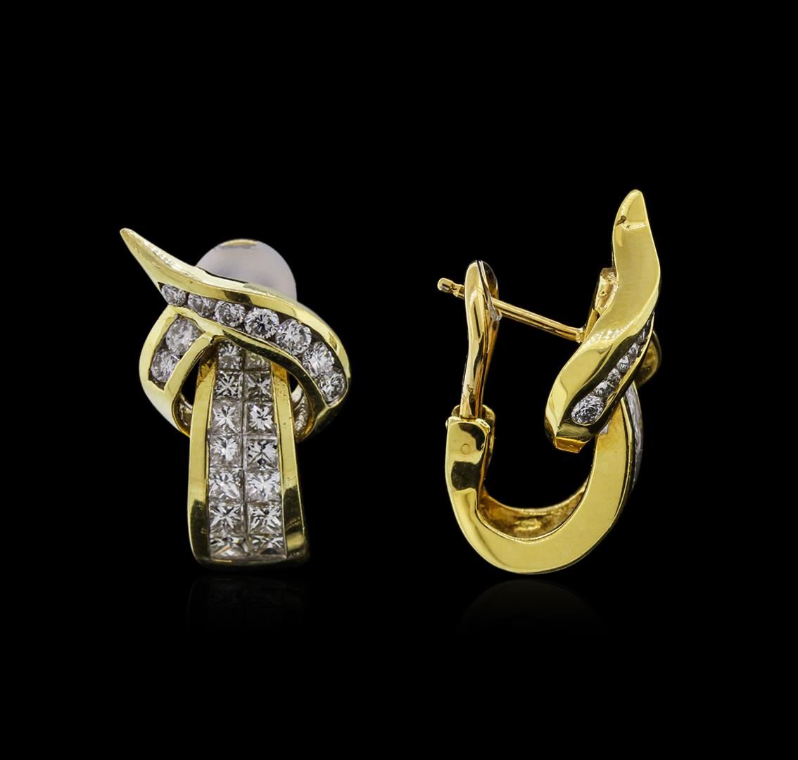 One pair electronically tested 18KT yellow gold ladies combination cast & assembled diamond earrings with Omega clip backs with posts with a bright polish finish. Condition is very good. Containing: Twenty-Eight channel set princess cut diamonds, measuring 2.00 x 2.00 x 1.50mm (depth est.) approximate total weight of 28 Stones = 1.38ct. Clarity: VS-1 to VS-2. Color: G - H, Cut is Good. Eighteen channel set round brilliant cut diamonds, measuring 1.90 - 1.70 x 1.08mm (depth est.) approximate total weight of 18 Stones = 0.38ct. Clarity: SI-1 to SI-2. Color: H - I, Cut is Good. Diamonds are graded in the mounting, unless otherwise stated. Total Weight of Diamonds 1.76ct. Total Weight of Earrings 12.00 grams. GGL Appraised at $5,230.00.
