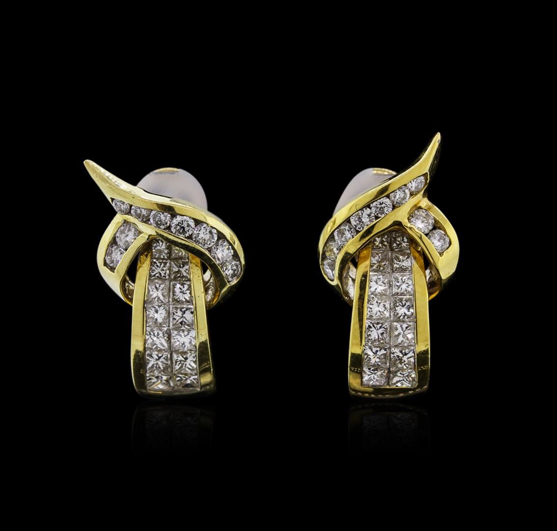 One pair electronically tested 18KT yellow gold ladies combination cast & assembled diamond earrings with Omega clip backs with posts with a bright polish finish. Condition is very good. Containing: Twenty-Eight channel set princess cut diamonds, measuring 2.00 x 2.00 x 1.50mm (depth est.) approximate total weight of 28 Stones = 1.38ct. Clarity: VS-1 to VS-2. Color: G - H, Cut is Good. Eighteen channel set round brilliant cut diamonds, measuring 1.90 - 1.70 x 1.08mm (depth est.) approximate total weight of 18 Stones = 0.38ct. Clarity: SI-1 to SI-2. Color: H - I, Cut is Good. Diamonds are graded in the mounting, unless otherwise stated. Total Weight of Diamonds 1.76ct. Total Weight of Earrings 12.00 grams. GGL Appraised at $5,230.00.