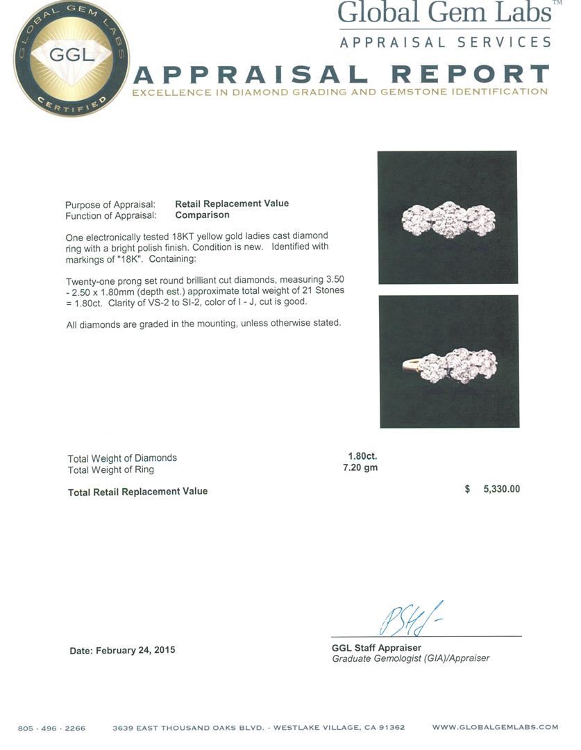 One electronically tested 18KT yellow gold ladies cast diamond ring with a bright polish finish. Identified with markings of "18K". Condition is new. Containing: Twenty-One prong set round brilliant cut diamonds, measuring 3.50 - 2.50 x 1.80mm (depth est.) approximate total weight of 21 Stones = 1.80ct. Clarity: VS-2 to SI-2. Color: I - J, Cut is Good. All diamonds are graded in the mounting, unless otherwise stated. Total Weight of Diamonds 1.80ct. Total Weight of Ring 7.20 grams. GGL Appraised at $5,330.00.