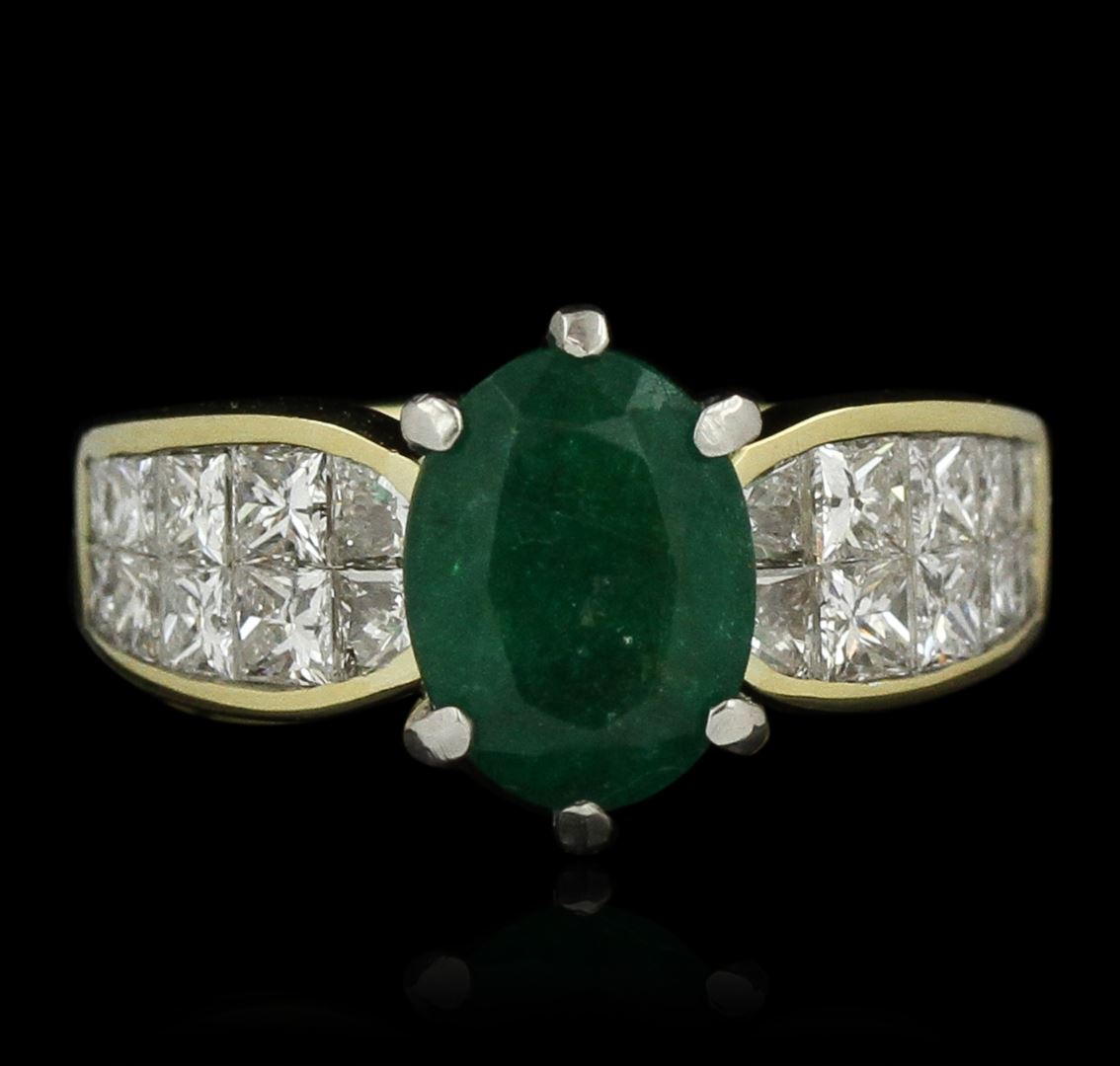 One electronically tested 18KT yellow gold ladies cast emerald and diamond ring. Condition is good. The featured emerald is supported by tapering diamond shoulders, completed by a three and one-half millimeter wide band. Bright polish finish with rhodium accents. Trademark is QUAD. Identified with markings of "750". Containing: One prong set oval mixed cut natural emerald, measuring 9.50 x 7.25 x 4.55mm, 8%. bulge factor, approximate weight of 1.88ct., clarity is heavily included, type III, medium dark, moderately strong, very slightly bluish green color, (GIA vslbG 6/4), cut is good. Transmitting light somewhat diffusely, transparent to translucent. Naturally occurring internal & external characteristics are present. Indications of oil residue. Graded in the setting. Twenty channel set fancy cut diamonds approximate. Total Weight of 20 Stones = 1.63ct. Graded in the setting. Clarity: VVS-2 to VS-1. Color: G - H. Total Weight of Colored Stones 1.88ct. Total Weight of Diamonds 1.63ct. Total Weight of Ring 7.82 grams. AIG Appraised at $9,865.00.