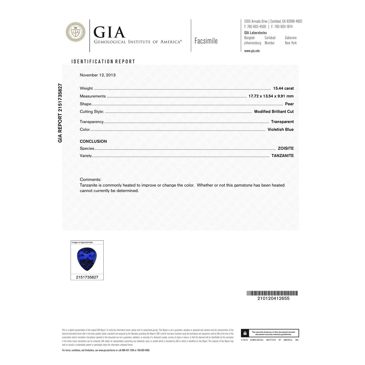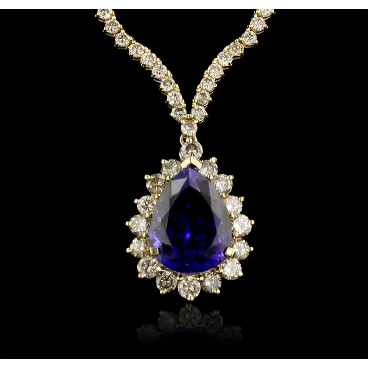 One electronically tested 18KT yellow gold Ladies combination cast & die struck necklace with a hidden box clasp with a bright polish finish. Identified with markings of "18K". Condition is excellent. Containing: One prong set pear modified brilliant cut natural tanzanite, measuring 17.72 x 13.54 x 9.91mm, approximate weight of 15.44ct., clarity is eye clean, type I, medium dark, moderately strong, violetish blue color, (GIA vB 6/4), cut is very good. GIA Colored Stone report attached. Graded loose prior to setting in the GIA Laboratory: Report #2151735827. Colored gemstones are presumed to have been subjected to commonly used and possible undetectable color/clarity enhancement processes. Ninety-Five prong set round brilliant cut diamonds, measuring 3.50 - 2.45 x 1.79mm (depth est.) approximate total weight of 95 Stones = 9.61ct. Clarity of I-1 to I-2, Color of K, Cut is Good. Total Weight of Colored Stones 15.44ct. Total eight of Diamonds 9.61ct. Total Weight of Necklace 24.80gm. GGL Appraised at $52,560.00.