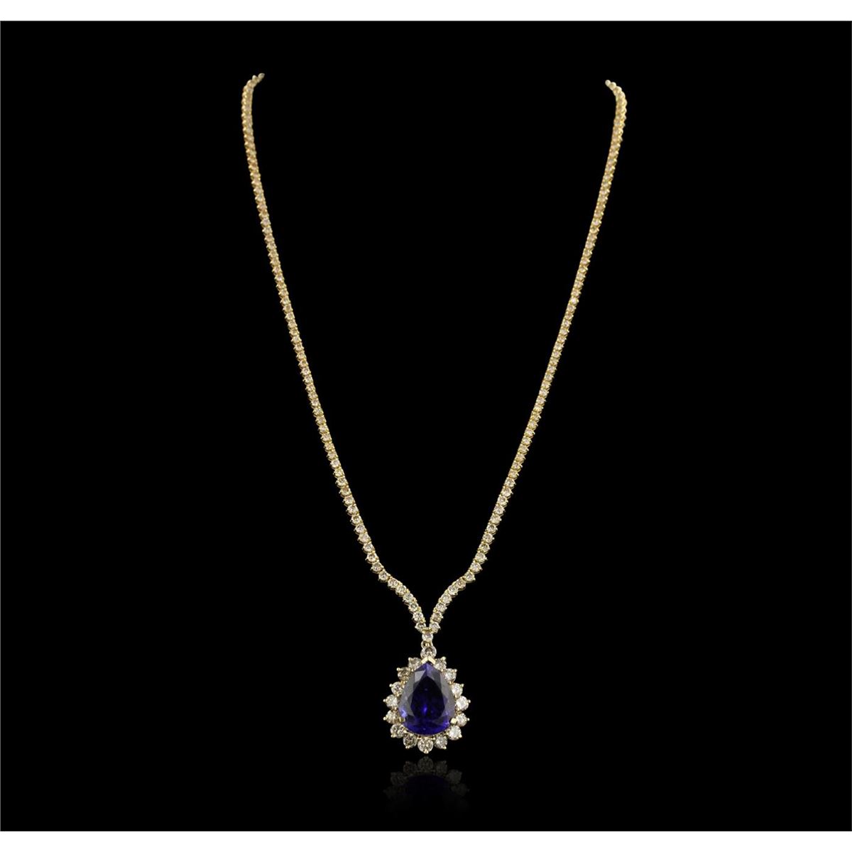 One electronically tested 18KT yellow gold Ladies combination cast & die struck necklace with a hidden box clasp with a bright polish finish. Identified with markings of "18K". Condition is excellent. Containing: One prong set pear modified brilliant cut natural tanzanite, measuring 17.72 x 13.54 x 9.91mm, approximate weight of 15.44ct., clarity is eye clean, type I, medium dark, moderately strong, violetish blue color, (GIA vB 6/4), cut is very good. GIA Colored Stone report attached. Graded loose prior to setting in the GIA Laboratory: Report #2151735827. Colored gemstones are presumed to have been subjected to commonly used and possible undetectable color/clarity enhancement processes. Ninety-Five prong set round brilliant cut diamonds, measuring 3.50 - 2.45 x 1.79mm (depth est.) approximate total weight of 95 Stones = 9.61ct. Clarity of I-1 to I-2, Color of K, Cut is Good. Total Weight of Colored Stones 15.44ct. Total eight of Diamonds 9.61ct. Total Weight of Necklace 24.80gm. GGL Appraised at $52,560.00.