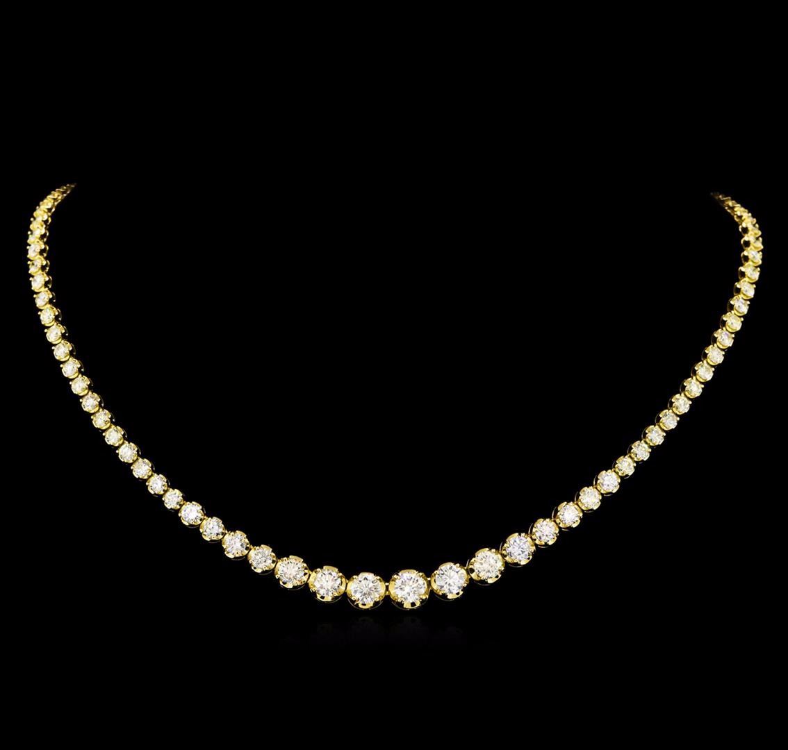 One electronically tested 18KT yellow gold ladies cast diamond necklace with a hidden box clasp with safety closer with a bright polish finish. Measurements: 16.50" in length Identified with markings of "K18". Condition is new. Containing: Three prong set round brilliant cut diamonds, measuring 5.60 - 5.60 x 3.36mm (depth est.) approximate total weight of 3 Stones = 1.93ct. Clarity: I-1. Color: K, Cut is Good. Seventy-Eight prong set round brilliant cut diamonds, measuring 3.90 - 3.00 x 2.07mm (depth est.) approximate total weight of 78 Stones = 11.08ct. Clarity: SI-1 to SI-2. Color: J - L, Cut is Good. Twelve prong set round brilliant cut diamonds, measuring 5.00 - 4.00 x 2.70mm (depth est.) approximate total weight of 12 Stones = 4.00ct. Clarity: SI-1 to SI-2. Color: J - K, Cut is Good. All diamonds are graded in the mounting, unless otherwise stated. Total Weight of Diamonds 17.01ct. Total Weight of Necklace 24.90 grams. GGL Appraised at $38,925.00.