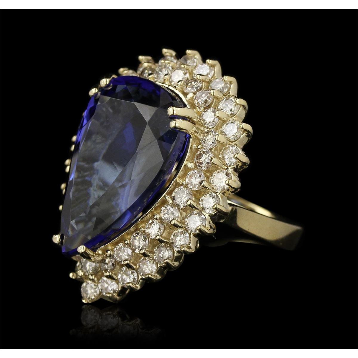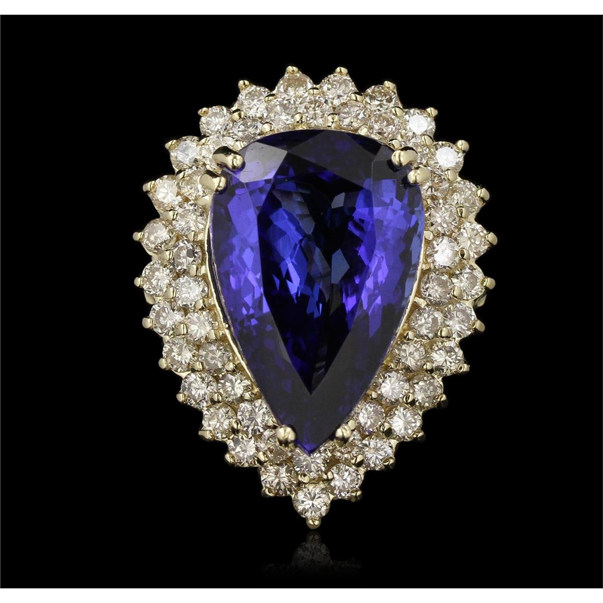 One electronically tested 18KT yellow gold ladies cast tanzanite and diamond ring with a bright polish finish. The featured tanzanite is set within a two tiered diamond lattice gallery, completed by a three millimeter wide band. Identified with markings of "K18". Condition is new, good workmanship. Containing: One prong set pear modified brilliant cut natural tanzanite, measuring 20.75 x 13.52 x 8.97mm, exact weight 17.41ct., clarity is eye clean, type I, medium dark, strong, violetish blue color, (GIA vB 6/5), cut is good. Transmitting light with no distortion, transparent. GIA Colored Stone Grading Report attached. Graded loose prior to setting in the GIA Laboratory, Report # 2151735648.Tanzanite is a very rare gemstone that is only found in the country of Tanzania. Originally discovered in 1967. Tiffany & Company, named the stone Tanzanite. It is found in the Usumburu Mountains that border the Umba Valley of northern Tanzania. Tanzanite occurs in gray, brown, violet, blue, reddish-purple, & green. The gem is interesting because of its exceptional pleochroism. Rotated in different directions a tanzanite will exhibit multiple changes of color. Tanzanite has a low tolerance to ultrasonic cleaning, and should not be cleaned using this method. Fifty-Three prong set round brilliant cut diamonds, measuring 2.40 - 2.30 x 1.41mm (depth est.) approximate. Total Weight of 53 Stones = 2.61ct. Graded in the setting. Clarity: SI-2 to I-1 . Color: G - I. Total Weight of Colored Stones 17.41ct. Total Weight of Diamonds 2.61ct. AIG Appraised at $59,000.00.