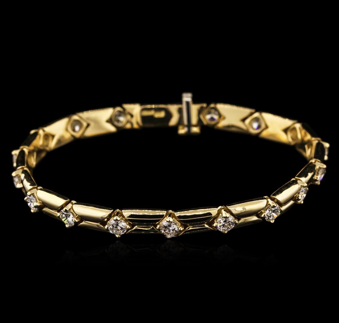 One electronically tested 18KT yellow gold ladies cast diamond bracelet with a hidden box clasp with safety closer with a bright polish finish. Measurements: 6.75" in length Trademark is FRED. Identified with markings of "18". Condition is new. Containing: Eighteen prong set round brilliant cut diamonds, measuring 3.50 - 3.50 x 2.10mm (depth est.) approximate total weight of 18 Stones = 2.82ct. Clarity: VS-1. Color: F, Cut is Very Good. Diamonds are graded in the mounting, unless otherwise stated. Total Weight of Diamonds 2.82ct. Total Weight of Bracelet 21.50 grams. GGL Appraised at $17,580.00.