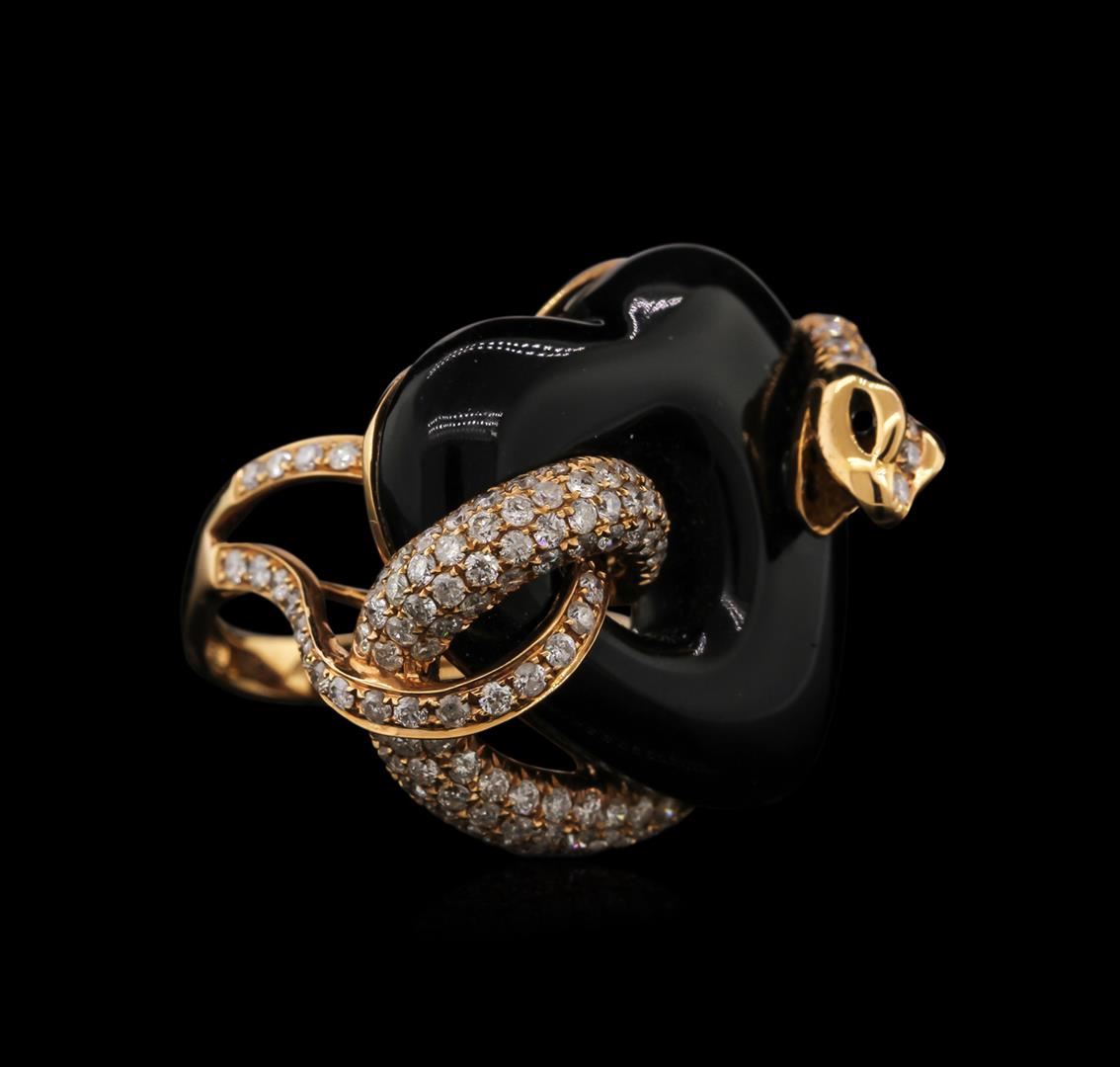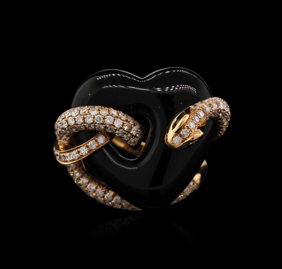 One electronically tested 18KT yellow gold ladies cast onyx and diamond heart ring with a bright polish finish. Identified with markings of "14K". Condition is new. Containing: One back setting set heart modified mixed cut natural black onyx, measuring 24.00. x 22.00. x 14.30mm, approximate weight of 24.73ct., clarity is severely included, black, strong, black color, (GIA Bl 10/5), cut is very good. Two prong set round brilliant cut diamonds, measuring 1.30 - 1.30 x 0.78mm (depth est.) approximate total weight of 2 Stones = 0.02ct. Cut is Good. One Hundred Forty-Seven prong set round brilliant cut diamonds, measuring 1.50 - 1.50 x 0.90mm (depth est.) approximate total weight of 147 Stones = 1.67ct. Clarity: I-1 to I-2. Color: I - J, Cut is Good. Colored gemstones are presumed to have been subjected to commonly used enhancement processes. All diamonds and colored gemstones are graded in the mounting, unless otherwise stated. Total Weight of Colored Stones 24.73ct. Total Weight of Diamonds 1.69ct. Total Weight of Heart Ring 13.40 grams. GGL Appraised at $4,240.00.