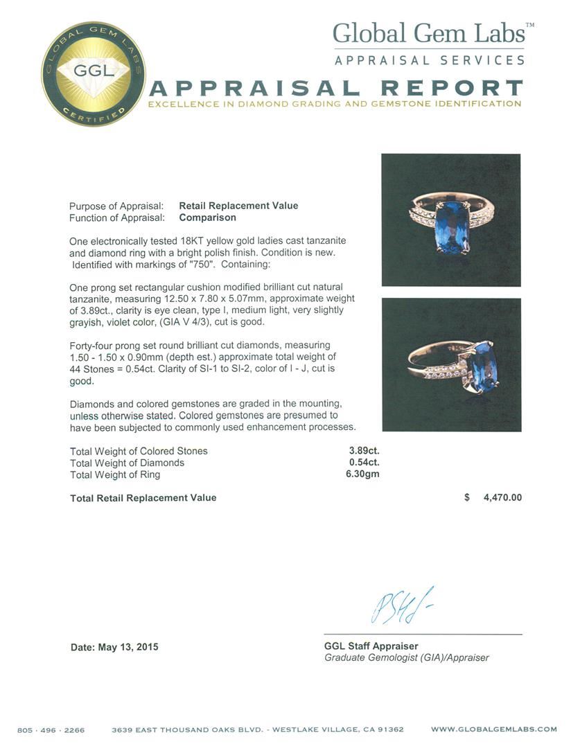 One electronically tested 18KT yellow gold ladies cast tanzanite and diamond ring with a bright polish finish. Identified with markings of "750". Condition is new. Containing: One prong set rectangular cushion modified brilliant cut natural tanzanite, measuring 12.50 x 7.80 x 5.07mm, approximate weight of 3.89ct., clarity is eye clean, type I, medium light, very slightly grayish, violet color, (GIA V 4/3), cut is good. Forty-Four prong set round brilliant cut diamonds, measuring 1.50 - 1.50 x 0.90mm (depth est.) approximate total weight of 44 Stones = 0.54ct. Clarity: SI-1 to SI-2. Color: I - J, Cut is Good. Diamonds and colored gemstones are graded in the mounting, unless otherwise stated. Colored gemstones are presumed to have been subjected to commonly used enhancement processes.. Total Weight of Colored Stones 3.89ct. Total Weight of Diamonds 0.54ct. Total Weight of Ring 6.30 grams. GGL Appraised at $4,470.00.