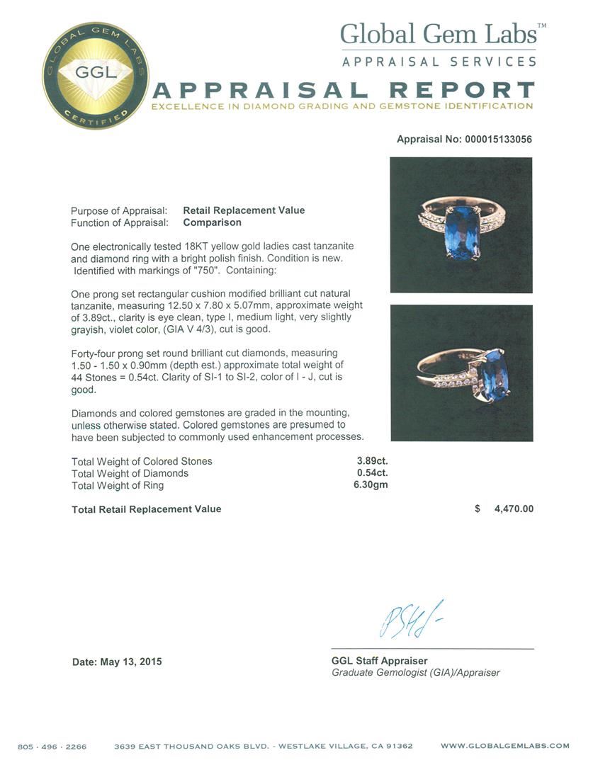 One electronically tested 18KT yellow gold ladies cast tanzanite and diamond ring with a bright polish finish. Identified with markings of "750". Condition is new. Containing: One prong set rectangular cushion modified brilliant cut natural tanzanite, measuring 12.50 x 7.80 x 5.07mm, approximate weight of 3.89ct., clarity is eye clean, type I, medium light, very slightly grayish, violet color, (GIA V 4/3), cut is good. Forty-Four prong set round brilliant cut diamonds, measuring 1.50 - 1.50 x 0.90mm (depth est.) approximate total weight of 44 Stones = 0.54ct. Clarity: SI-1 to SI-2. Color: I - J, Cut is Good. Diamonds and colored gemstones are graded in the mounting, unless otherwise stated. Colored gemstones are presumed to have been subjected to commonly used enhancement processes.. Total Weight of Colored Stones 3.89ct. Total Weight of Diamonds 0.54ct. Total Weight of Ring 6.30 grams. GGL Appraised at $4,470.00.