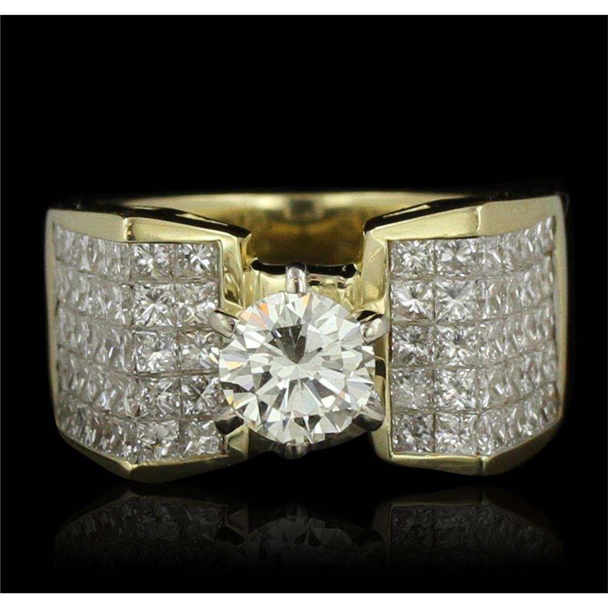 One electronically tested 18KT Yellow Gold ladies cast & assembled diamond unity ring. Condition is good. The featured diamond is cathedral set within a White Gold basket supported by stylized diamond set shoulders, completed by a seven millimeter wide band. Bright polish finish with rhodium accents. Identified with markings of "18K". Containing: One prong set round brilliant cut diamond, measuring 6.40 - 6.39 x 4.20mm (depth est.) approximate weight of 1.14ct. Faint brown secondary color throughout. Diamond Grading Report attached. Graded in the setting. Clarity: SI-1. Depth: 65.6%. Table 64.8%. Seventy invisible set princess cut diamonds, measuring 1.90 x 1.80 x 1.35mm (depth est.) approximate. Total Weight of 70 Stones = 2.75ct. Graded in the setting. Clarity: VS-2 to SI-2. Color: G - I. Total Weight of Diamonds 3.89ct. Total Weight of Ring 19.28 grams. AIG Appraised at $25,105.00.