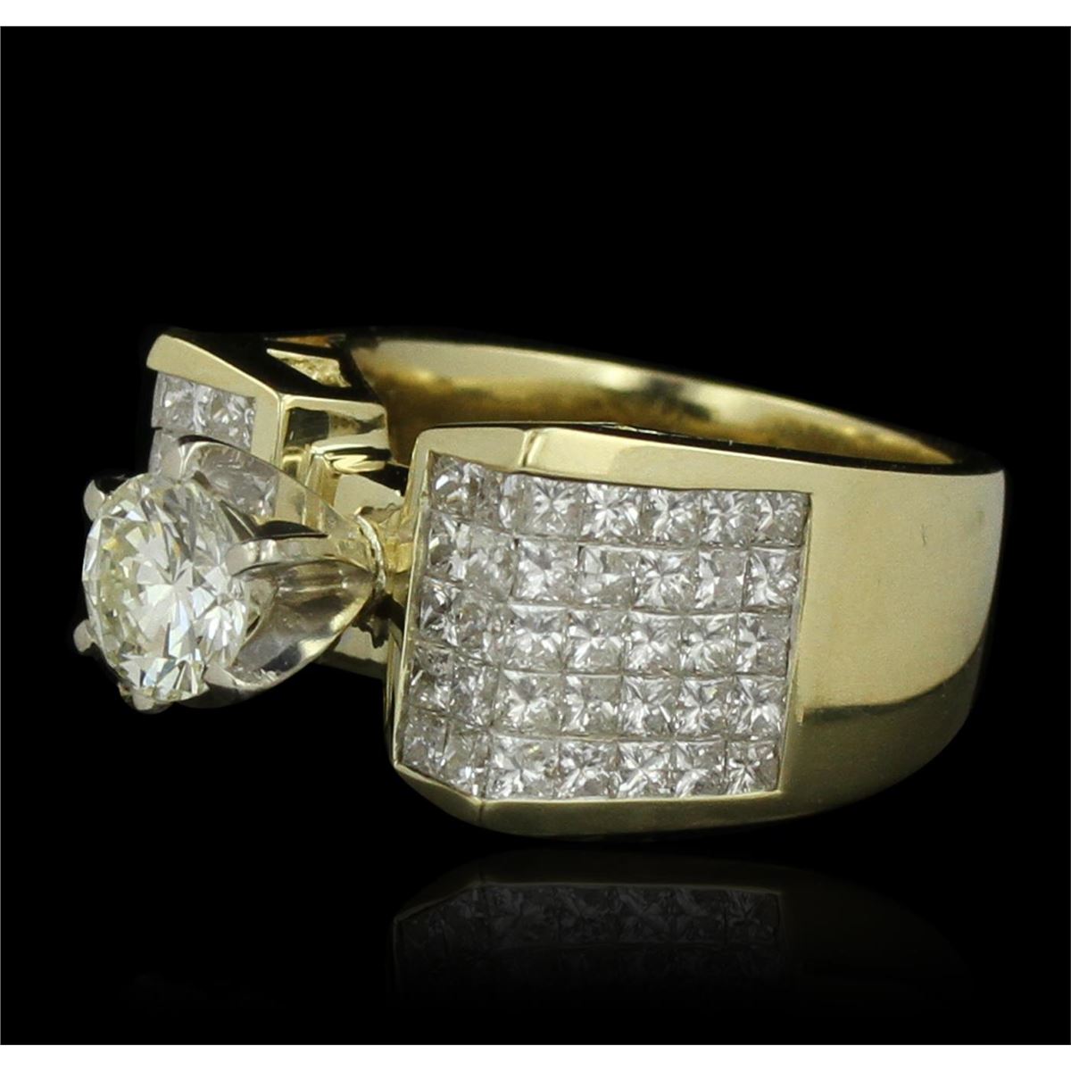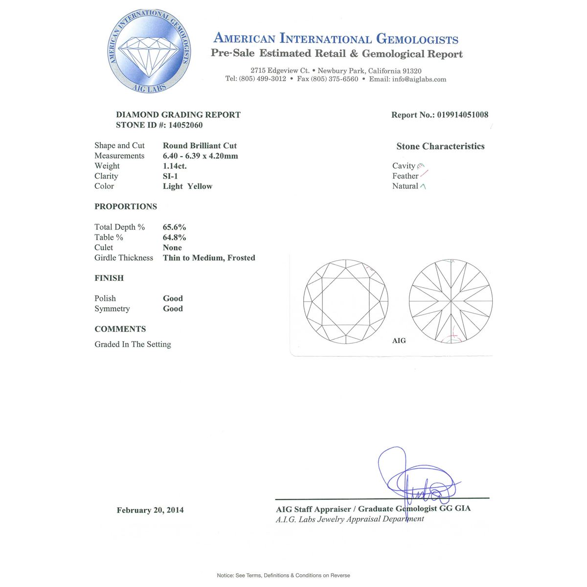 One electronically tested 18KT Yellow Gold ladies cast & assembled diamond unity ring. Condition is good. The featured diamond is cathedral set within a White Gold basket supported by stylized diamond set shoulders, completed by a seven millimeter wide band. Bright polish finish with rhodium accents. Identified with markings of "18K". Containing: One prong set round brilliant cut diamond, measuring 6.40 - 6.39 x 4.20mm (depth est.) approximate weight of 1.14ct. Faint brown secondary color throughout. Diamond Grading Report attached. Graded in the setting. Clarity: SI-1. Depth: 65.6%. Table 64.8%. Seventy invisible set princess cut diamonds, measuring 1.90 x 1.80 x 1.35mm (depth est.) approximate. Total Weight of 70 Stones = 2.75ct. Graded in the setting. Clarity: VS-2 to SI-2. Color: G - I. Total Weight of Diamonds 3.89ct. Total Weight of Ring 19.28 grams. AIG Appraised at $25,105.00.