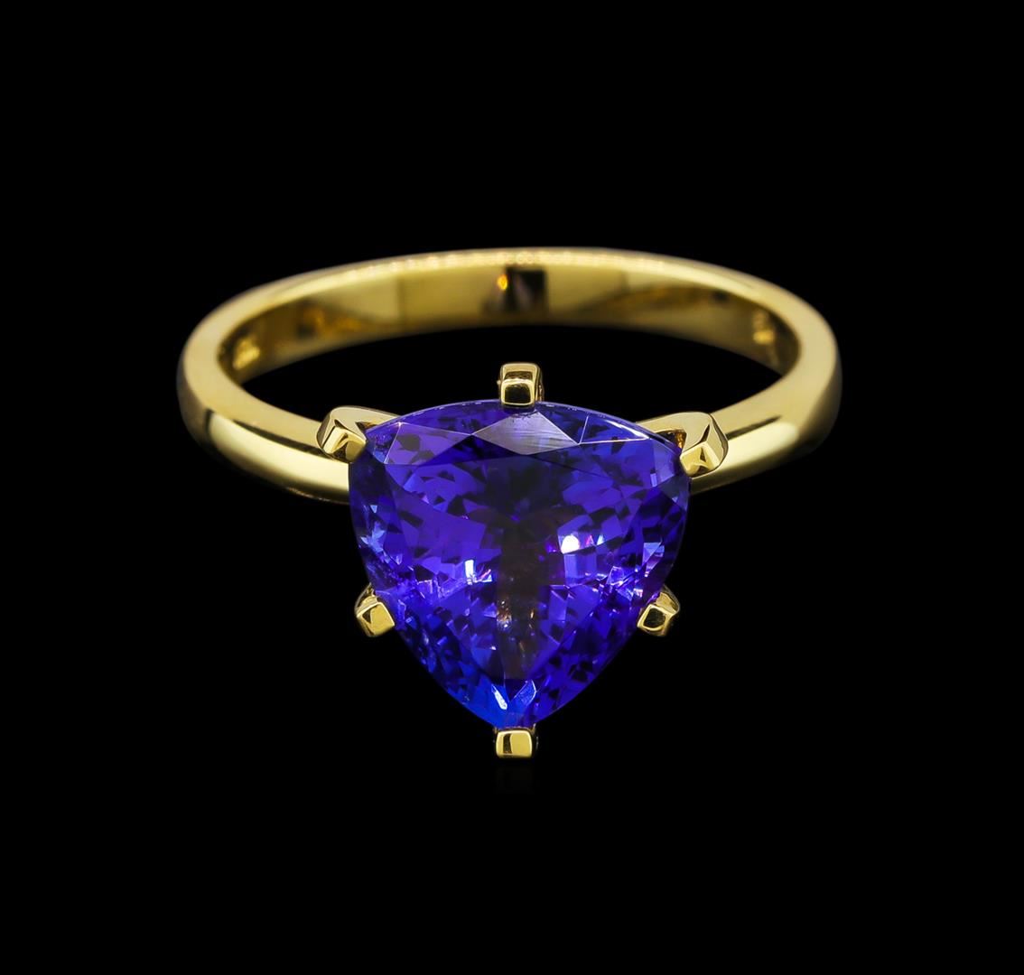 One electronically tested 18KT yellow gold ladies cast tanzanite ring with a bright polish finish. Identified with markings of "18K". Condition is new. Containing: One prong set triangle modified brilliant cut natural tanzanite, measuring 10.20 x 10.20 x 7.69mm, approximate weight of 4.82ct., clarity is eye clean, type I, medium, moderately strong, blue color, (GIA B 5/4), cut is good. Colored gemstones are presumed to have been subjected to commonly used enhancement processes. All colored gemstones are graded in the mounting, unless otherwise stated. Total Weight of Colored Stones 4.82ct. Total Weight of Ring 4.70 grams. GGL Appraised at $2,610.00.
