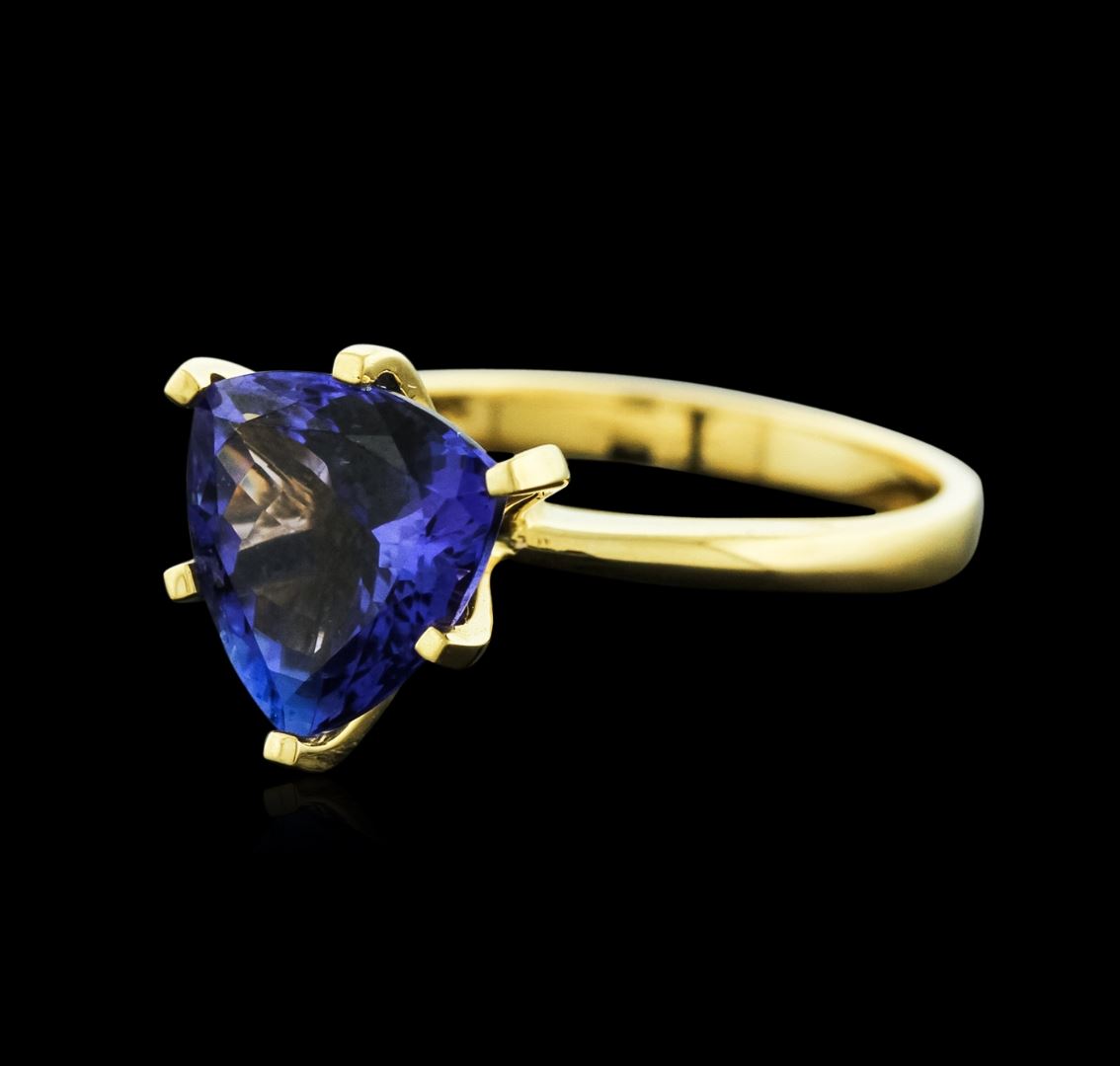 One electronically tested 18KT yellow gold ladies cast tanzanite ring with a bright polish finish. Identified with markings of "18K". Condition is new. Containing: One prong set triangle modified brilliant cut natural tanzanite, measuring 10.20 x 10.20 x 7.69mm, approximate weight of 4.82ct., clarity is eye clean, type I, medium, moderately strong, blue color, (GIA B 5/4), cut is good. Colored gemstones are presumed to have been subjected to commonly used enhancement processes. All colored gemstones are graded in the mounting, unless otherwise stated. Total Weight of Colored Stones 4.82ct. Total Weight of Ring 4.70 grams. GGL Appraised at $2,610.00.
