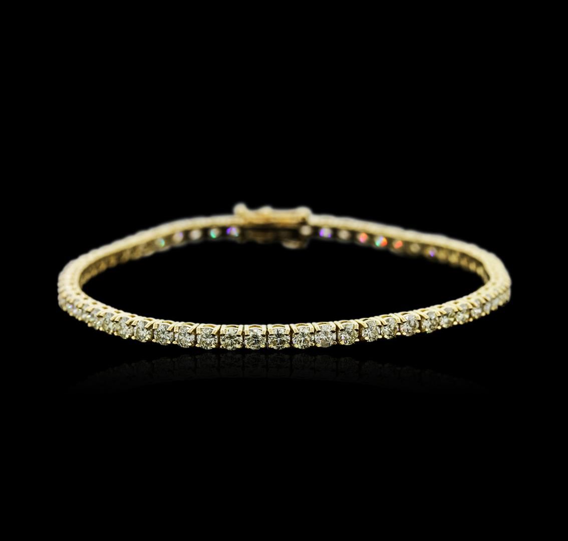One electronically tested 18KT yellow gold ladies cast diamond tennis bracelet with a hidden box clasp with safety closer with a bright polish finish. Measurements: 7" in length Identified with markings of "750". Condition is new. Containing: Sixty-Two prong set round brilliant cut diamonds, measuring 2.80 - 2.80 x 1.68mm (depth est.) approximate total weight of 62 Stones = 4.98ct. Clarity: SI-1 to SI-2. Color: L - M, Cut is Good. All diamonds are graded in the mounting, unless otherwise stated. Total Weight of Diamonds 4.98ct. Total Weight of Tennis Bracelet 9.20 grams. GGL Appraised at $6,130.00.