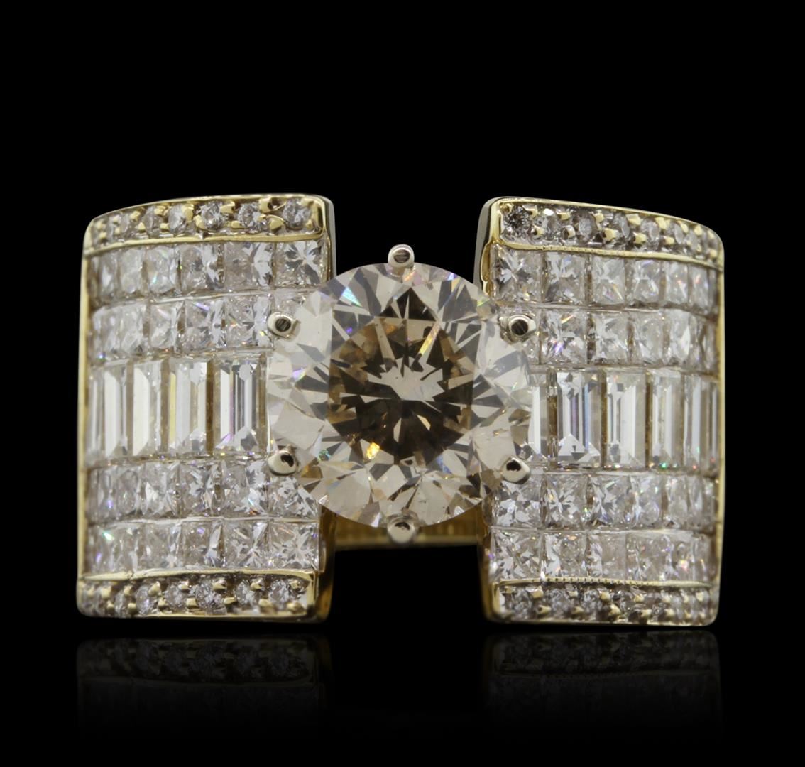 One electronically tested 18KT yellow gold ladies cast & assembled diamond ring with a bright polish finish. Condition is new, good workmanship. The featured diamond is cathedral set supported by elaborate diamond set shoulders, completed by a eight millimeter wide band. Identified with markings of "18K". Containing: One prong set round brilliant cut diamond, measuring 8.65 - 8.60 x 5.30mm (depth est.), 8.00%. GTCF approximate weight of 2.61ct with a medium strong blue fluorescence. Diamond Grading Report attached. Graded in the setting. Clarity: SI-2. Depth: 61.4%. Table 59.1%. Twelve invisible set baguette cut diamonds, measuring 3.50 x 2.10 x 1.47mm (depth est.) approximate. Total Weight of 12 Stones = 1.10ct. Graded in the setting. Clarity: VVS-2 to VS-2. Color: G - I. Fifty-Six invisible set princess cut diamonds, measuring 1.80 x 1.70 x 1.20mm (depth est.) approximate. Total Weight of 56 Stones = 1.73ct. Graded in the setting. Clarity: VS-2 to SI-2. Color: G - I. Thirty-Two bead set round brilliant cut diamonds, measuring 1.10 - 1.00 x 0.63mm (depth est.) approximate. Total Weight of 32 Stones = 0.17ct. Graded in the setting. Clarity: VS-1 to SI-1. Color: G - I. Total Weight of Diamonds 5.61ct. Total Weight of Ring 18.12gm. AIG Appraised at $60,960.00.