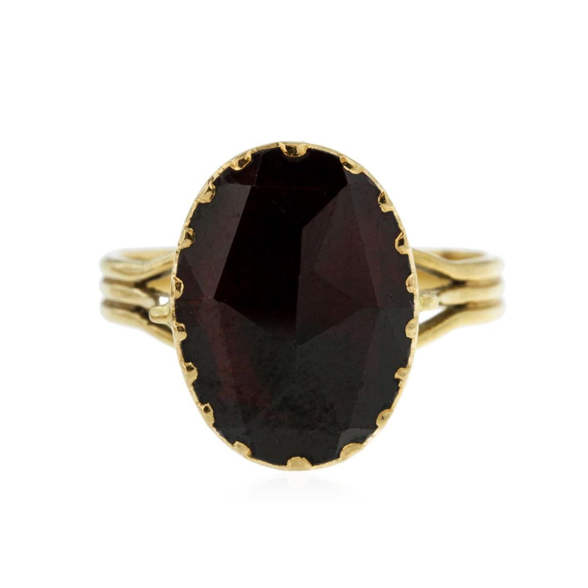 One electronically tested 18KT yellow gold ladies custom cast & hand crafted pyrope-almandite garnet ensemble. The ensemble includes an anklet/bracelet, a ring, two pendants and a pair of earrings. The nine and one-quarter inch length anklet/bracelet features a flexible garnet ribbon, terminating in a box clasp with safety chain. The garnet solitaire ring is supported by three-way split shoulders, completed by a grooved three millimeter wide band. One of the pendants features two inch by one and one-quarter inch length garnet cross, completed by a yellow gold bail. The second pendant features a garnet solitaire, also completed by a yellow gold bail. The garnet ensemble is completed by a matching pair of solitaire garnet earrings with standard backs. Bright polish finish with rope detailing. Hallmarks: French, 18KT. Identified with markings of "750". Condition is good. Containing: One bezel set rose cabochon mixed cut natural pyrope-almandite garnet, measuring 16.00 x 11.00 x 3.70mm, approximate weight of 7.12ct., clarity is eye clean, dark, slightly brownish, orangy red color, (GIA oR 7/2), cut is good. Transmitting light with no distortion, transparent. Graded in the setting. Six bezel set rose cabochon cut natural pyrope-almandite garnets, measuring 8.00 x 6.00 x 3.00mm, approximate total weight of 9.42ct., clarity is eye clean, dark, slightly brownish, orangy red color, (GIA oR 7/2), cut is good. Transmitting light with no distortion, transparent. Measurements & the color grade are an average for the group. Graded in the setting. Sixteen bezel set rose cabochon cut natural pyrope-almandite garnets, measuring 8.50 x 8.40 x 3.00mm, approximate total weight of 37.44ct., clarity is eye clean, dark, slightly brownish, orangy red color, (GIA oR 7/2), cut is good. Transmitting light with no distortion, transparent. Color grade is an average for the group. Graded in the setting. Two bezel set rose cabochon cut natural pyrope-almandite garnets, measuring 6.00 x 5.90 x 2.50mm, approximate total weight of 1.94ct., clarity is eye clean, dark, slightly brownish, orangy red color, (GIA oR 7/2), cut is good. Transmitting light with no distortion, transparent. Color grade is an average for the pair. Graded in the setting. Total Weight of Colored Stones 55.92ct. Total Weight of Ensemble 35.99 grams. AIG Appraised at $8,660.00.