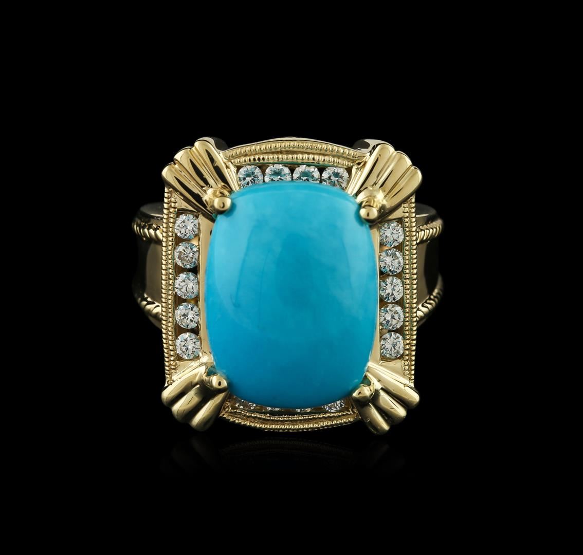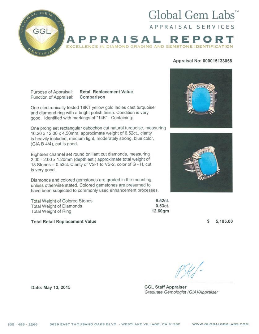 One electronically tested 18KT yellow gold ladies cast turquoise and diamond ring with a bright polish finish. Identified with markings of "14K". Condition is very good. Containing: One prong set rectangular cabochon cut natural turquoise, measuring 16.20 x 12.00 x 4.50mm, approximate weight of 6.52ct., clarity is heavily included, medium light, moderately strong, blue color, (GIA B 4/4), cut is good. Eighteen channel set round brilliant cut diamonds, measuring 2.00 - 2.00 x 1.20mm (depth est.) approximate total weight of 18 Stones = 0.53ct. Clarity: VS-1 to VS-2. Color: G - H, Cut is Very Good. Diamonds and colored gemstones are graded in the mounting, unless otherwise stated. Colored gemstones are presumed to have been subjected to commonly used enhancement processes.. Total Weight of Colored Stones 6.52ct. Total Weight of Diamonds 0.53ct. Total Weight of Ring 12.60 grams. GGL Appraised at $5,185.00.