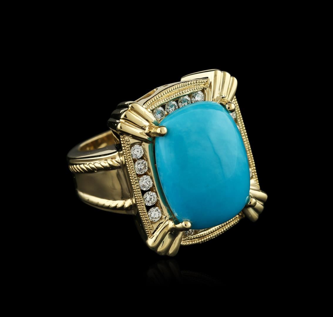 One electronically tested 18KT yellow gold ladies cast turquoise and diamond ring with a bright polish finish. Identified with markings of "14K". Condition is very good. Containing: One prong set rectangular cabochon cut natural turquoise, measuring 16.20 x 12.00 x 4.50mm, approximate weight of 6.52ct., clarity is heavily included, medium light, moderately strong, blue color, (GIA B 4/4), cut is good. Eighteen channel set round brilliant cut diamonds, measuring 2.00 - 2.00 x 1.20mm (depth est.) approximate total weight of 18 Stones = 0.53ct. Clarity: VS-1 to VS-2. Color: G - H, Cut is Very Good. Diamonds and colored gemstones are graded in the mounting, unless otherwise stated. Colored gemstones are presumed to have been subjected to commonly used enhancement processes.. Total Weight of Colored Stones 6.52ct. Total Weight of Diamonds 0.53ct. Total Weight of Ring 12.60 grams. GGL Appraised at $5,185.00.