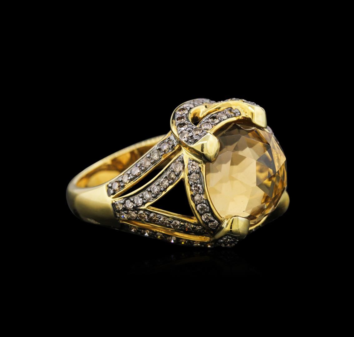 One ring featuring: 18KT yellow gold weighing 10.53 grams containing one citrine center stone with a total weight of 7.48ct and 105 brown diamonds with a total weight of 1.03ct.
