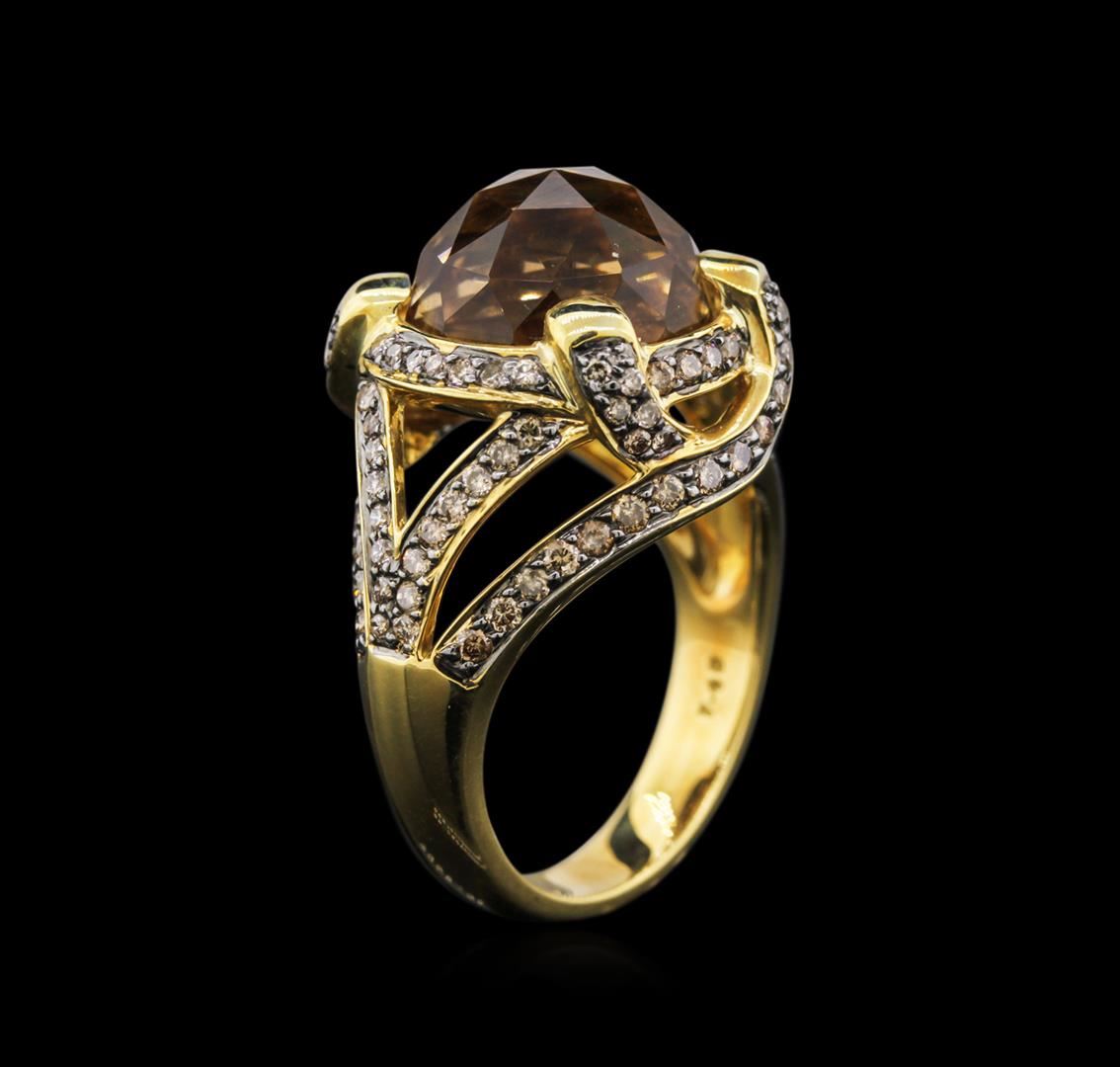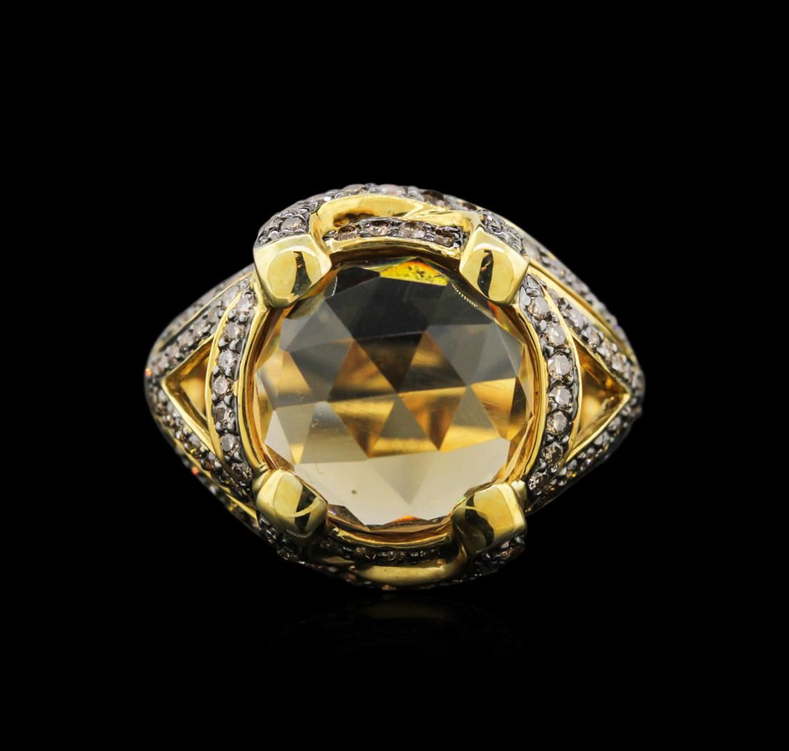 One ring featuring: 18KT yellow gold weighing 10.53 grams containing one citrine center stone with a total weight of 7.48ct and 105 brown diamonds with a total weight of 1.03ct.