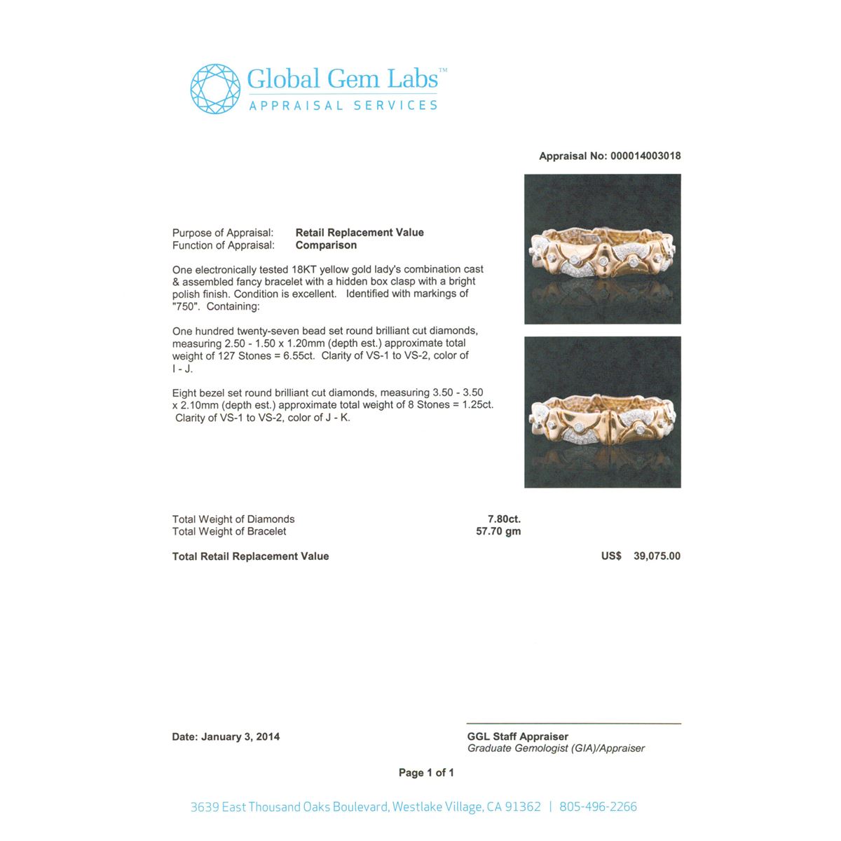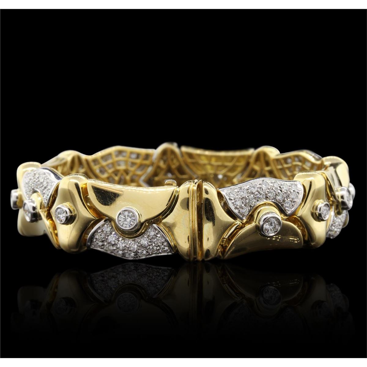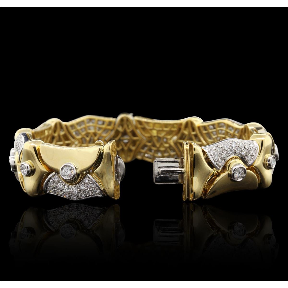 One electronically tested 18KT yellow gold Ladies combination cast & assembled fancy bracelet with a hidden box clasp with a bright polish finish. Identified with markings of "750". Condition is excellent. Containing: One Hundred Twenty-Seven bead set round brilliant cut diamonds, measuring 2.50 - 1.50 x 1.20mm (depth est.) approximate total weight of 127 Stones = 6.55ct. Clarity of VS-1 to VS-2, Color of I - J. Eight bezel set round brilliant cut diamonds, measuring 3.50 - 3.50 x 2.10mm (depth est.) approximate total weight of 8 Stones = 1.25ct. Clarity of VS-1 to VS-2, Color of J - K. Total Weight of Diamonds 7.80ct. Total Weight of Bracelet 57.70gm. GGL Appraised at $39,075.00.