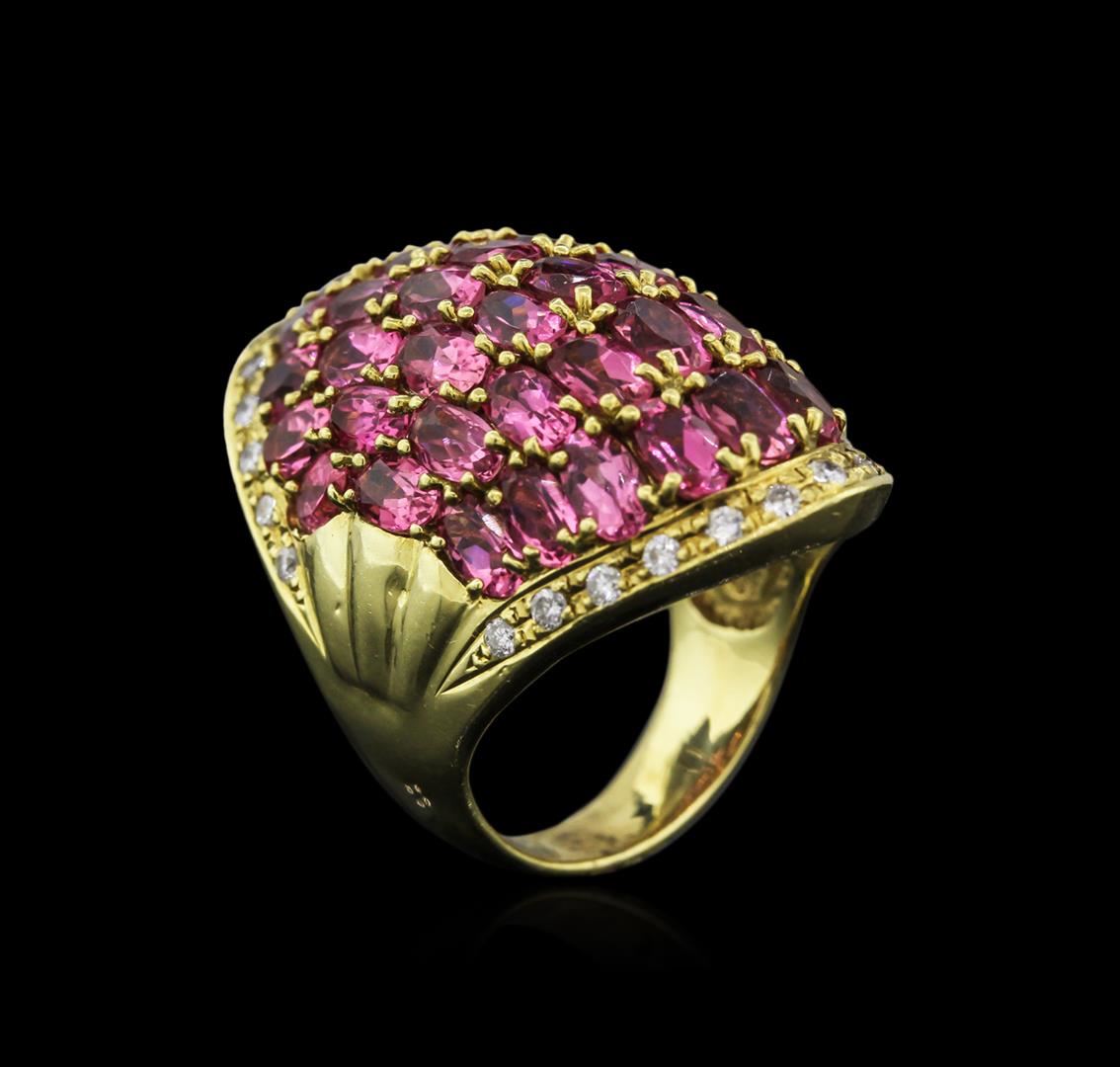 One electronically tested 18KT yellow gold ladies cast tourmaline and diamond ring with a bright polish finish. Identified with markings of "18K". Condition is new. Containing: Forty-four prong set oval modified brilliant cut natural pink tourmalines, measuring 5.00 x 3.00 x 1.95mm, approximate total weight of 8.36ct., clarity is eye clean, type II, medium light, slightly grayish, reddish purple color, (GIA rP 4/2), cut is good. Twenty-Four prong set round brilliant cut diamonds, measuring 1.50 - 1.50 x 0.90mm (depth est.) approximate total weight of 24 Stones = 0.30ct. Clarity: SI-1 to I-1. Color: H - I, Cut is Good. All diamonds and colored gemstones are graded in the mounting, unless otherwise stated. Colored gemstones are presumed to have been subjected to commonly used enhancement processes. Total Weight of Colored Stones 8.36ct. Total Weight of Diamonds 0.30ct. Total Weight of Ring 16.90 grams. GGL Appraised at $5,595.00.