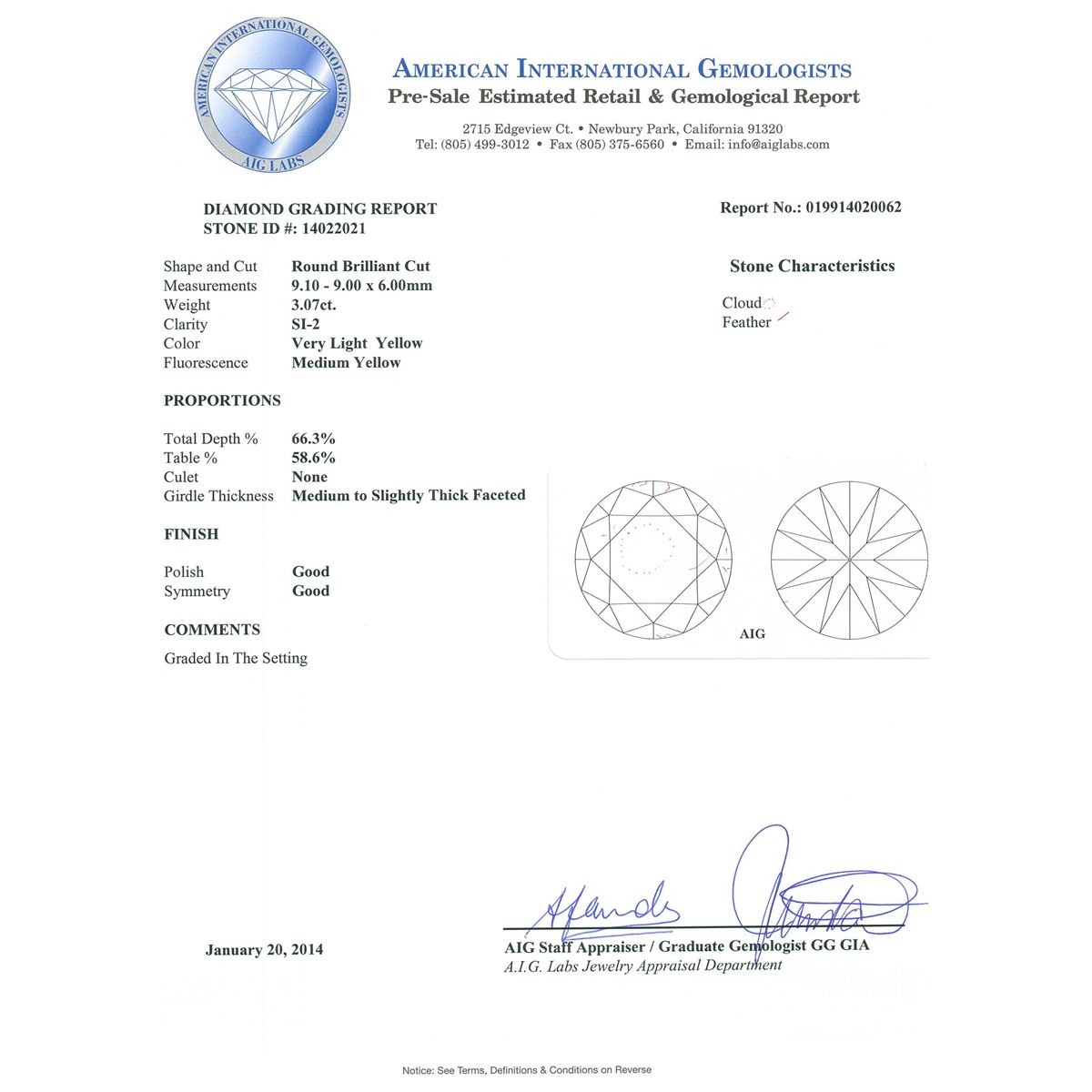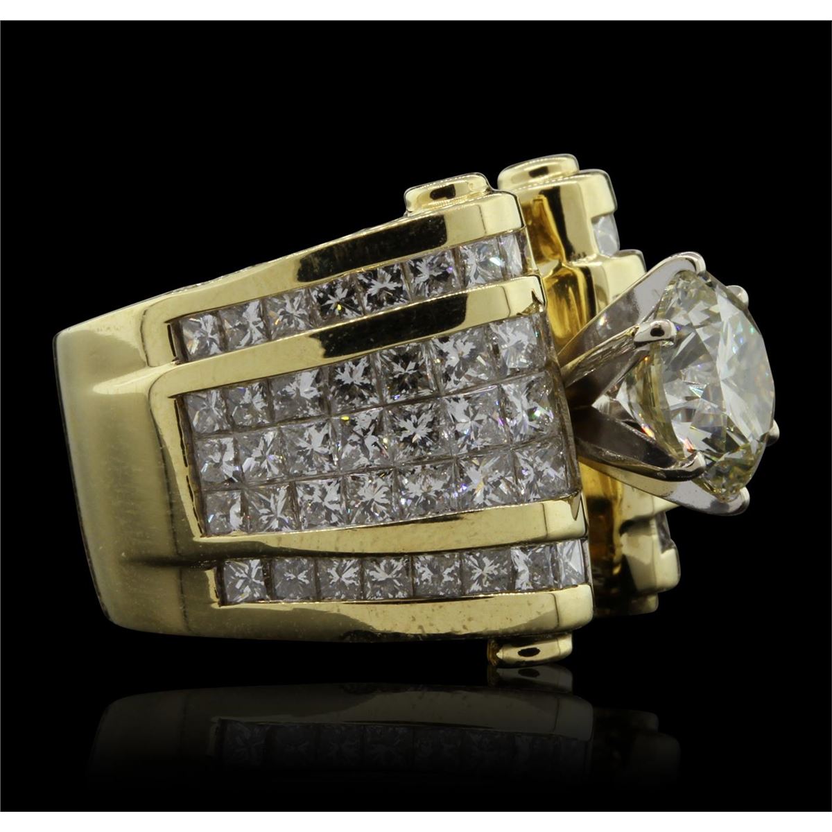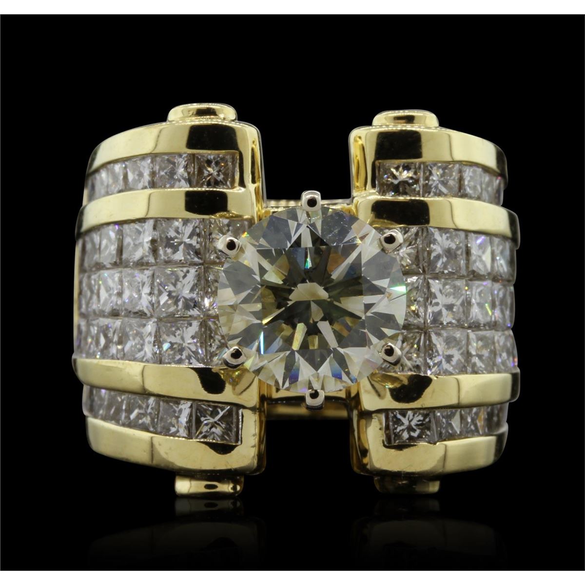 One electronically tested 18KT yellow gold ladies cast & assembled diamond unity ring with a bright polish finish. Condition is good. The featured diamond is cathedral set within diamond set tapering shoulders, completed by an eleven and one-half millimeter wide band. Identified with markings of "18K". Containing: One prong set round brilliant cut diamond, measuring 9.10 - 9.00 x 6.00mm (depth est.) approximate weight of 3.07ct with a medium yellow fluorescence. Diamond Grading Report attached. Graded in the setting. Clarity: SI-2. Depth: 66.3%. Table 58.6%. Eighty invisible and channel set princess cut diamonds, measuring 2.60 x 2.00 x 1.50mm (depth est.) approximate. Total Weight of 80 Stones = 5.25ct. Graded in the setting. Clarity: SI-1 to SI-2. Color: G - I. Twenty bead & bezel set round brilliant cut diamonds, measuring 2.30 - 1.30 x 1.08mm (depth est.) approximate. Total Weight of 20 Stones = 0.49ct. Graded in the setting. Clarity: VS-2 to SI-1. Color: G - I. Total Weight of Diamonds 8.81ct. Total Weight of Ring 33.65gm. AIG Appraised at $81,210.00.
