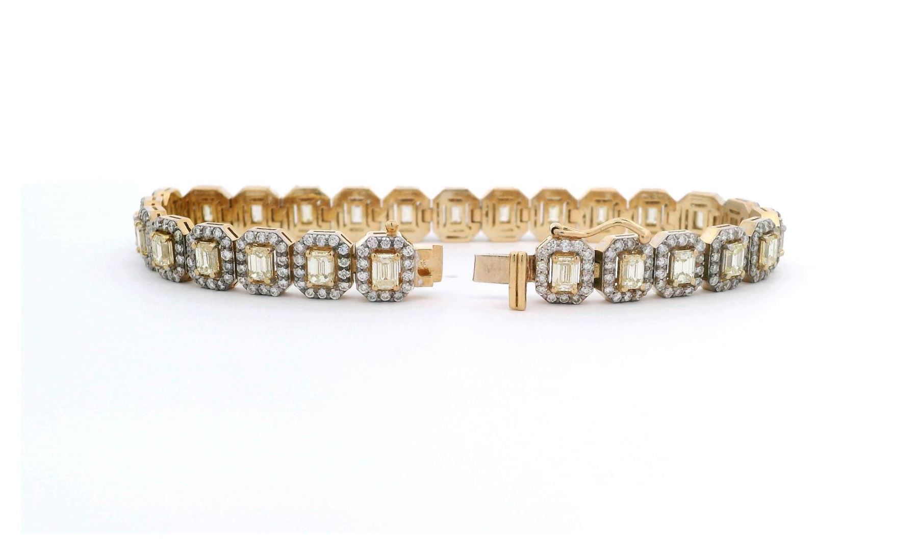 A luxurious 18KT yellow gold tennis bracelet adorned with 26 fancy light yellow emerald cut diamonds weighing 5.52 carats and 364 round brilliant cut diamonds weighing 3.39 carats, totaling 8.91 carats. The 7-inch bracelet is secured with a tongue clasp and foldover safety, featuring a high-polished finish and exquisite craftsmanship. Estimated Retail Value: $57,750.