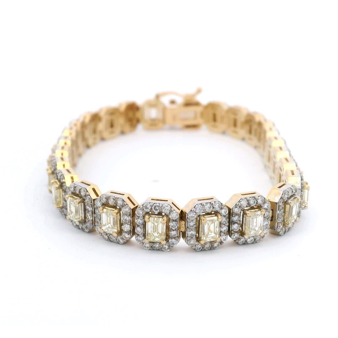 A luxurious 18KT yellow gold tennis bracelet adorned with 26 fancy light yellow emerald cut diamonds weighing 5.52 carats and 364 round brilliant cut diamonds weighing 3.39 carats, totaling 8.91 carats. The 7-inch bracelet is secured with a tongue clasp and foldover safety, featuring a high-polished finish and exquisite craftsmanship. Estimated Retail Value: $57,750.