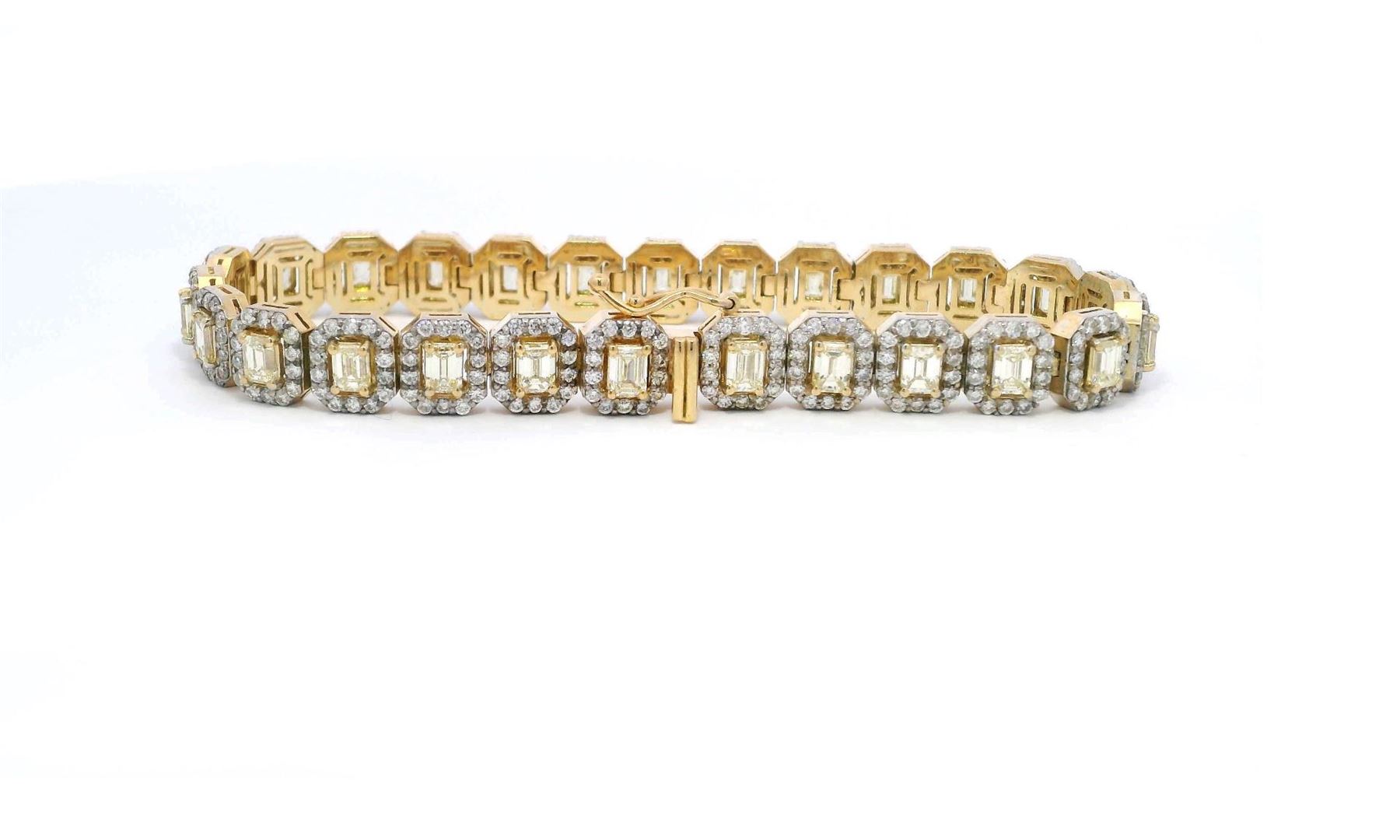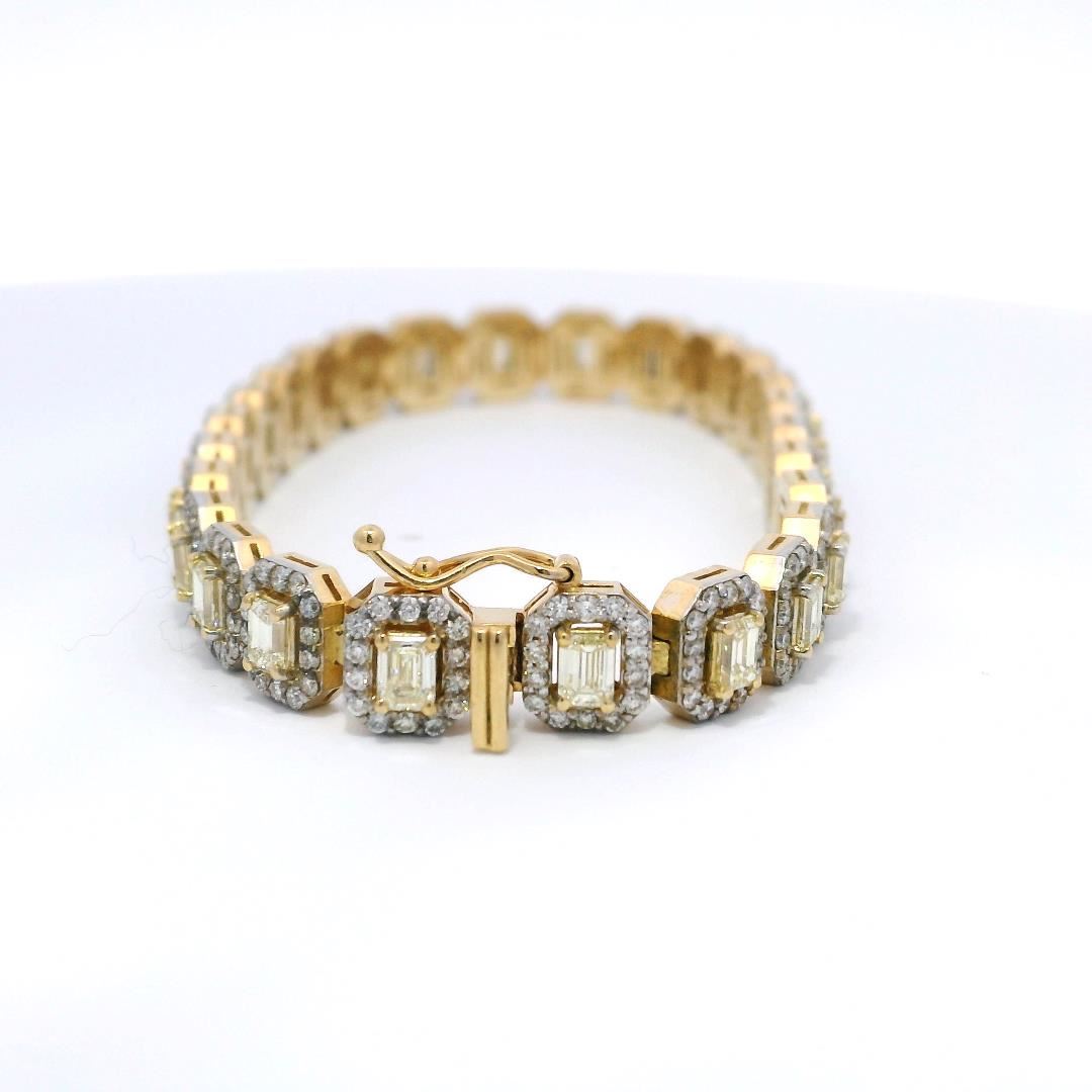 A luxurious 18KT yellow gold tennis bracelet adorned with 26 fancy light yellow emerald cut diamonds weighing 5.52 carats and 364 round brilliant cut diamonds weighing 3.39 carats, totaling 8.91 carats. The 7-inch bracelet is secured with a tongue clasp and foldover safety, featuring a high-polished finish and exquisite craftsmanship. Estimated Retail Value: $57,750.