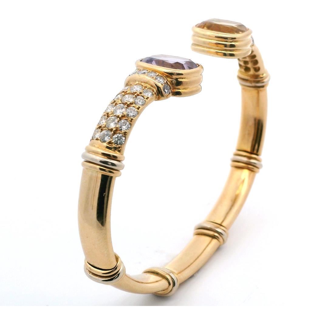 This vibrant 18KT yellow gold cuff bangle bracelet showcases two bezel-set rectangular cushion-cut gemstones: a 3.70-carat amethyst and a 3.71-carat citrine quartz. Complemented by 42 round brilliant cut diamonds totaling 1.85 carats, the 6 1/2-inch bracelet features a bright polished finish, offering a unique combination of color and elegance. Estimated Retail Value: $14,800.
