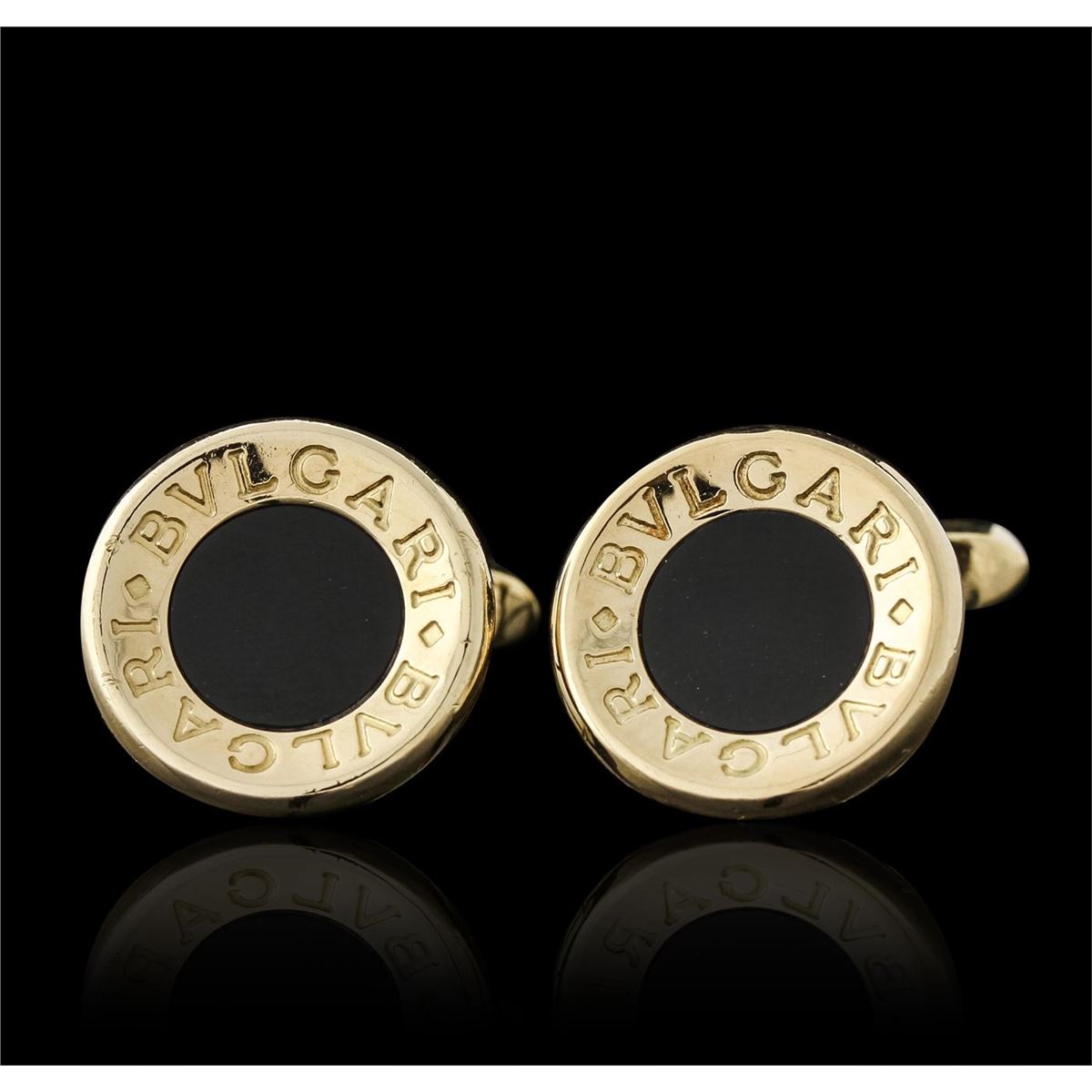 One pair of cuff links featuring: 18KT yellow gold weighing 19.30 grams containing two black onyxs and engraved with BULGARI. 40443.
