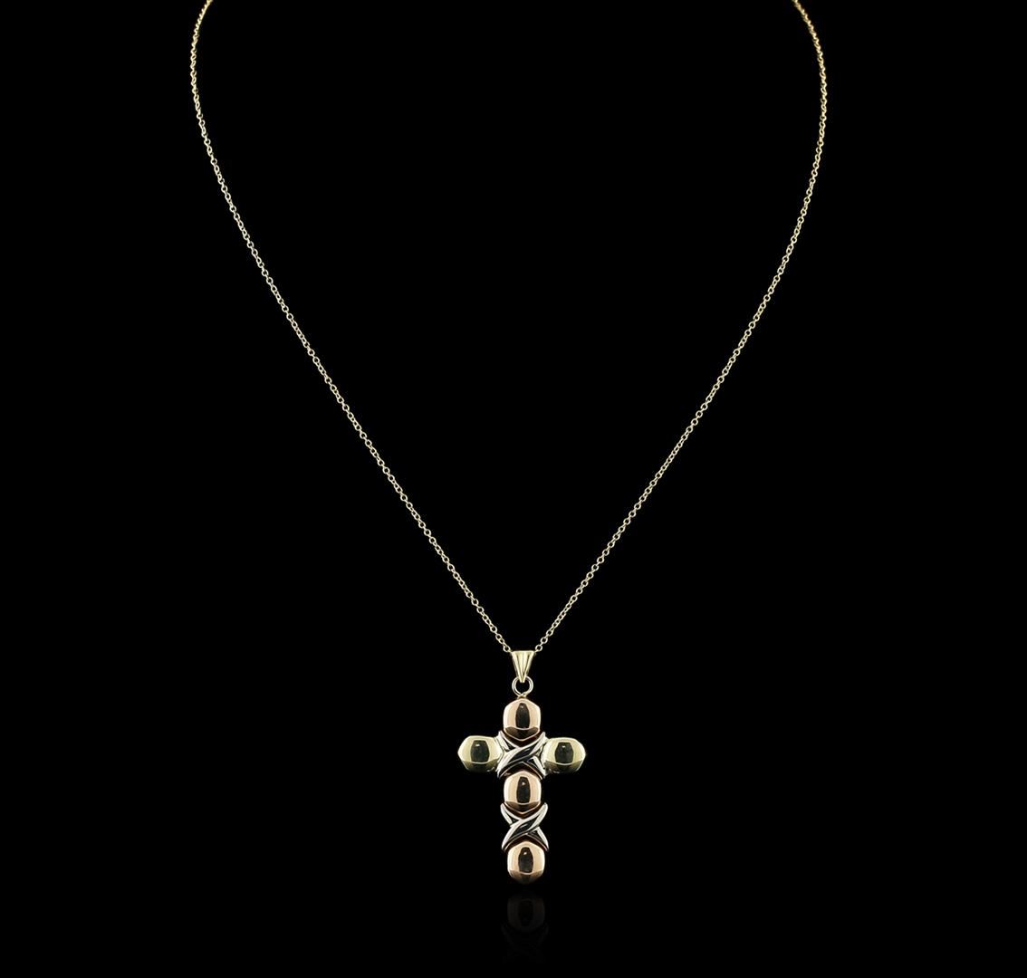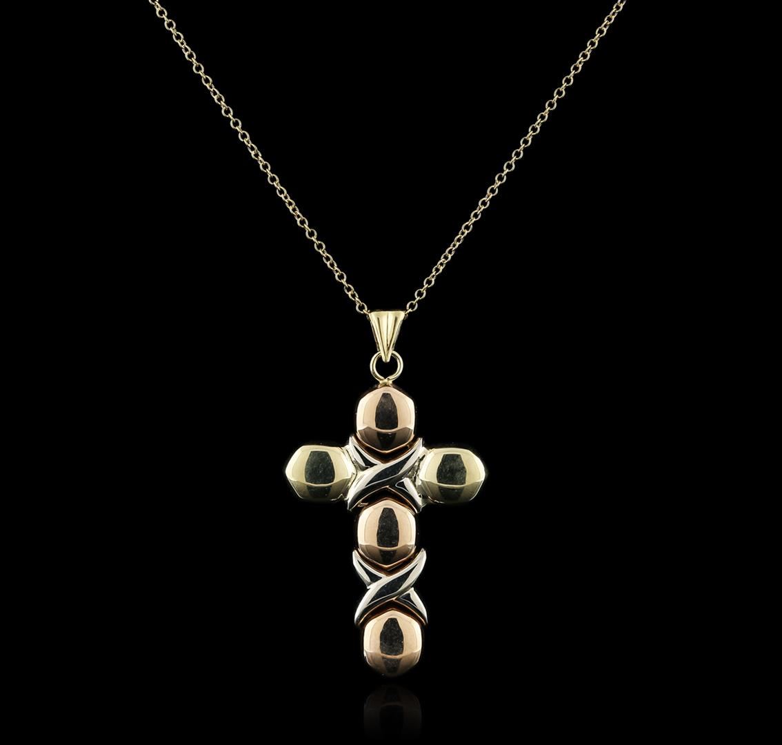 One cross pendant with chain featuring: 18KT yellow gold weighing 3.85 grams.