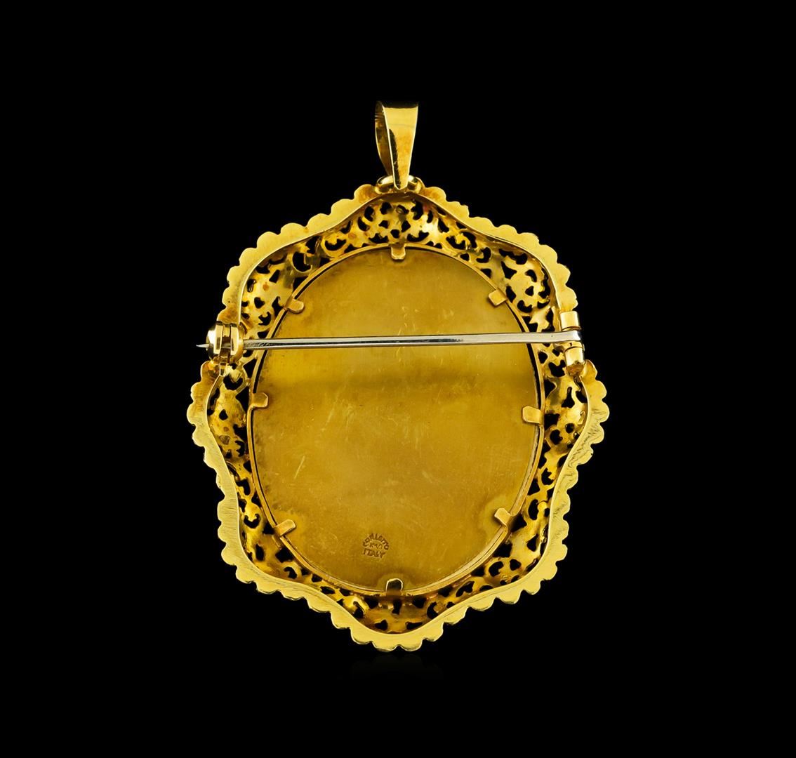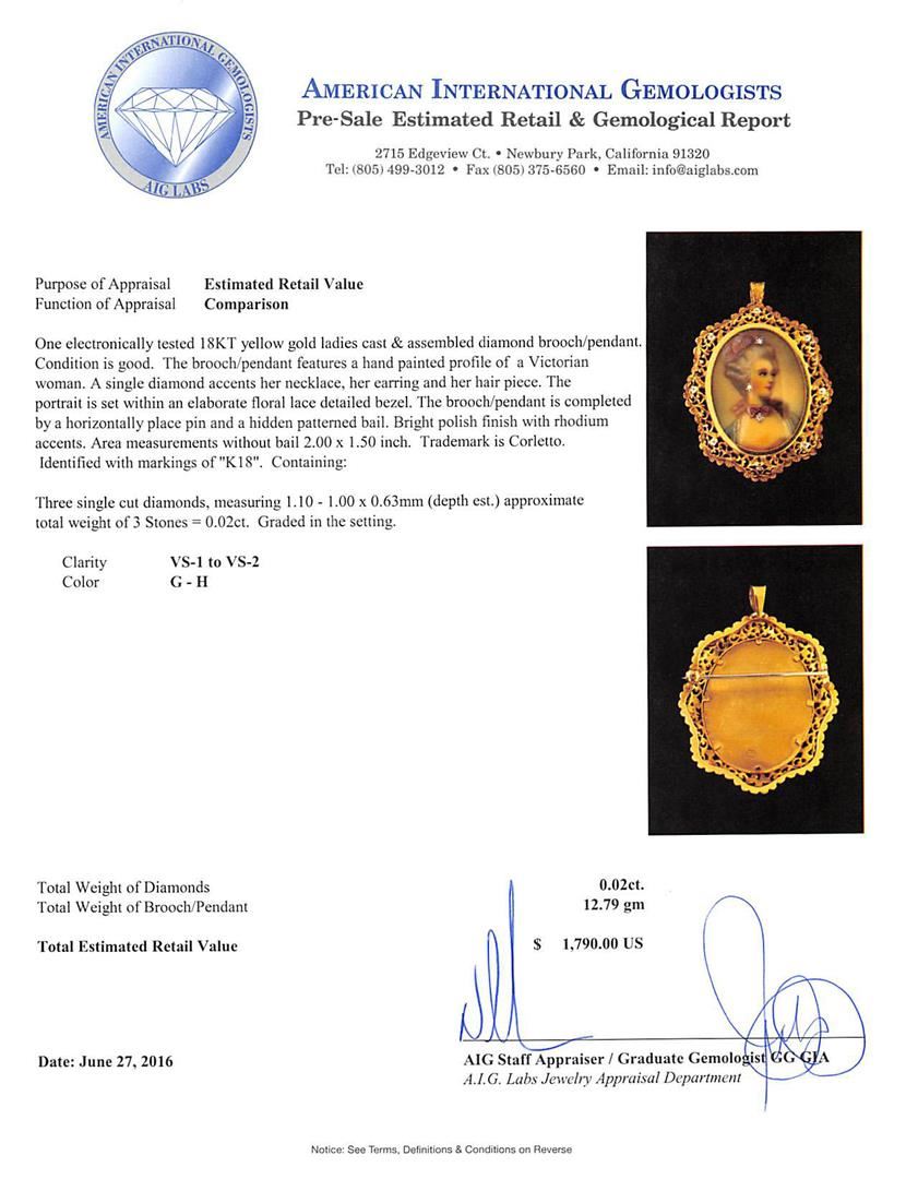 One electronically tested 18KT yellow gold ladies cast & assembled diamond brooch/pendant. The brooch/pendant features a hand painted profile of a Victorian woman. A single diamond accents her necklace, her earring and her hair piece. The portrait is set within an elaborate floral lace detailed bezel. The brooch/pendant is completed by a horizontally place pin and a hidden patterned bail. Bright polish finish with rhodium accents. Area measurements without bail 2.00 x 1.50 inch. Trademark is Corletto. Identified with markings of "K18". Condition is good. Containing: Three single cut diamonds, measuring 1.10 - 1.00 x 0.63mm (depth est.) approximate total weight of 3 Stones = 0.02ct. Graded in the setting. Clarity: VS-1 to VS-2. Color: G - H. Total Weight of Diamonds 0.02ct. Total Weight of Brooch/Pendant 12.79gm. AIG Appraised at $1,790.00.